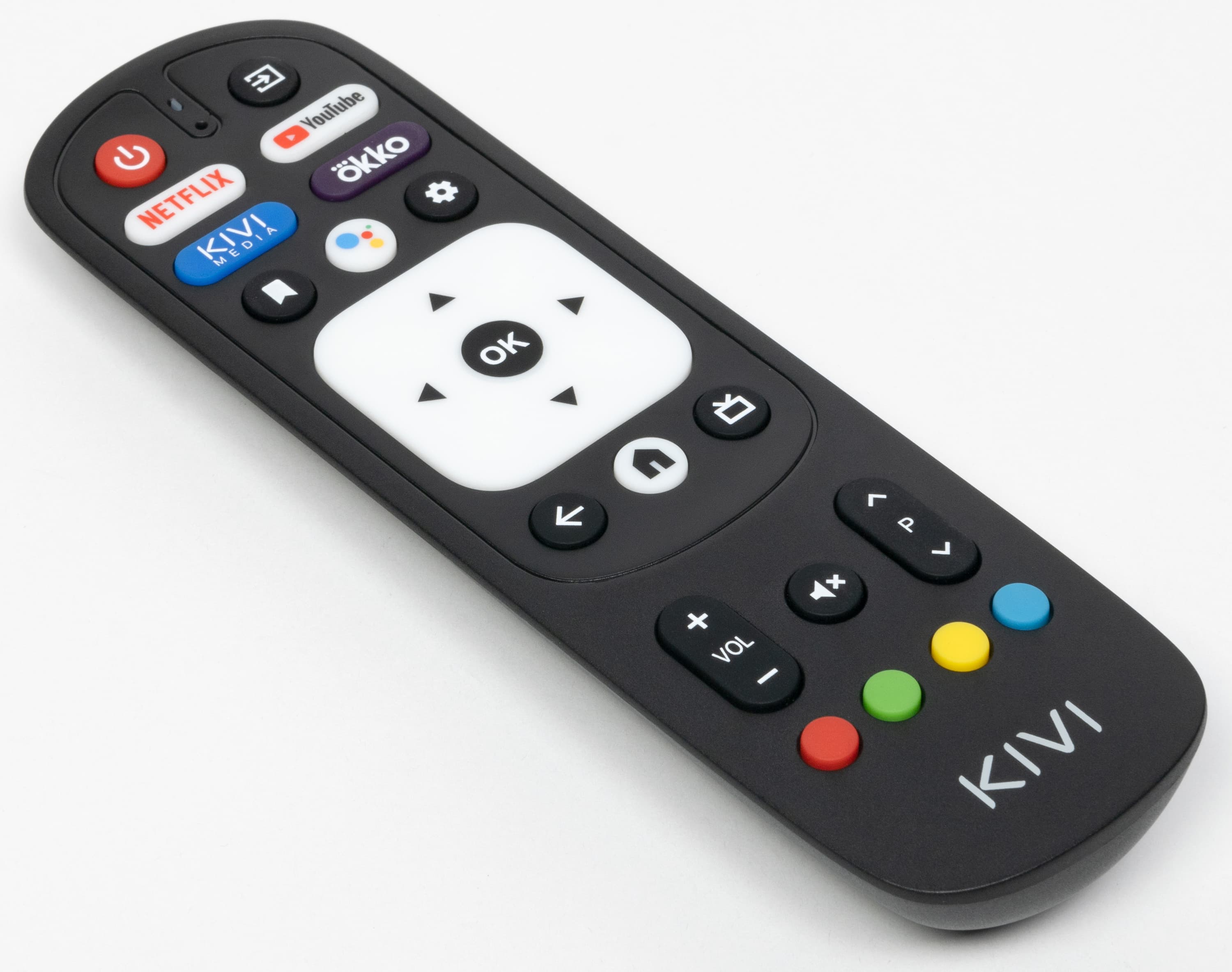Корпус пульта изготовлен из черного пластика с матовой поверхностью. Кнопки изготовлены из резиноподобного материала. Обозначения кнопок достаточно контрастные и крупные. Самих кнопок немного, но организация интерфейса и не очень богатая функциональная оснащенность не дают особого повода сожалеть об отсутствии дополнительных кнопок. Тем не менее, на пульте есть кнопки для быстрого запуска ряда приложений, которые по сути только занимают место и иногда отнимают у пользователя время из-за случайного запуска (или попытки запуска в случае Netflix) программы. Пульт гибридный, он может работать как по ИК, так и по Bluetooth. По ИК пульт работает до сопряжения с телевизором или тогда, когда телевизор находится в глубоком сне. Во всех остальных случаях ИК-передатчик не работает, и команды передаются по Bluetooth. В передней части пульта рядом с индикатором есть отверстие микрофона. Голосовой помощник от Google запускается при нажатии на кнопку с цветастыми кружками (для ввода голосовой команды держать ее не нужно, а при включенном микрофоне на пульте горит красный индикатор), также его можно запустить с домашней страницы. Этот помощник поможет найти контент, который предоставляют ряд программ, и ответить на какие-то вопросы (показывает и проговаривает ответ), например, какая сейчас погода за окном.
