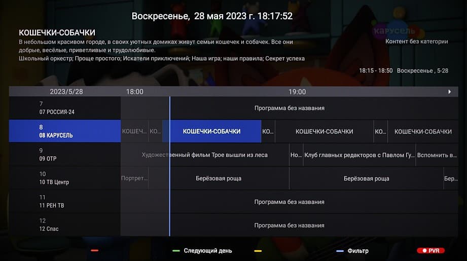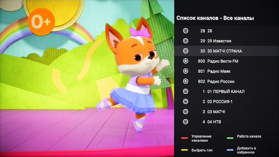 Присутствует список избранных программ. Есть поддержка электронной программы передач — можно посмотреть, что именно идет или будет идти на текущем и других каналах.