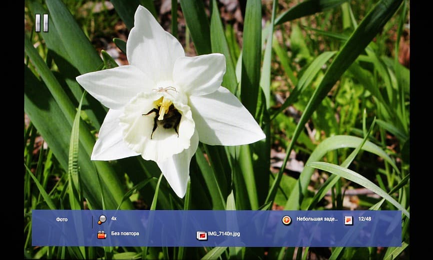 Нами подтверждена способность встроенного плеера телевизора показывать растровые графические файлы в форматах JPEG, GIF, PNG и BMP, в том числе в виде слайд-шоу с тремя вариантами задержки и несколькими эффектами перехода в том числе со случайным выбором эффекта. При этом изображение можно увеличить в 2 и 4 раза, но режима подгонки к границам экрана нет. Яркостная четкость при выводе изображений на экран высокая и соответствует разрешению 4К, тогда как цветовая четкость чуть-чуть снижена, и то только в горизонтальном направлении.
