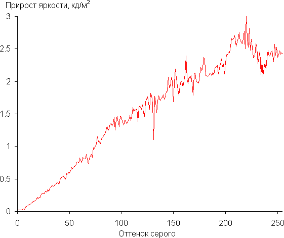 Для оценки характера роста яркости мы измерили яркость 256 оттенков серого (от 0, 0, 0 до 255, 255, 255) при подключении к ПК в режиме RGB при 3840×2160 и 60 Гц. График ниже показывает прирост (не абсолютное значение!) яркости между соседними полутонами: