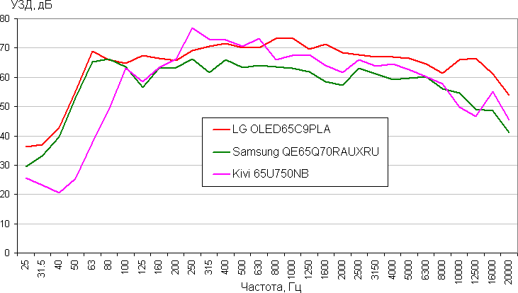 Громкость встроенной акустической системы для жилой комнаты, соответствующей по размерам данной диагонали экрана, достаточная. Стереофонический эффект выражен хорошо. Присутствуют высокие и средние частоты, низких — немного. Явно есть паразитные резонансы корпуса, но даже на максимальной громкости нет значительных искажений сигналов с высоким уровнем. В целом для класса встроенной в телевизор акустики ее качество приемлемое. Сравним АЧХ этого ТВ с АЧХ двух телевизоров высшего класса (получена с помощью шумомера при воспроизведении звукового файла с розовым шумом, интервал УЗД в 1/3 октавах):