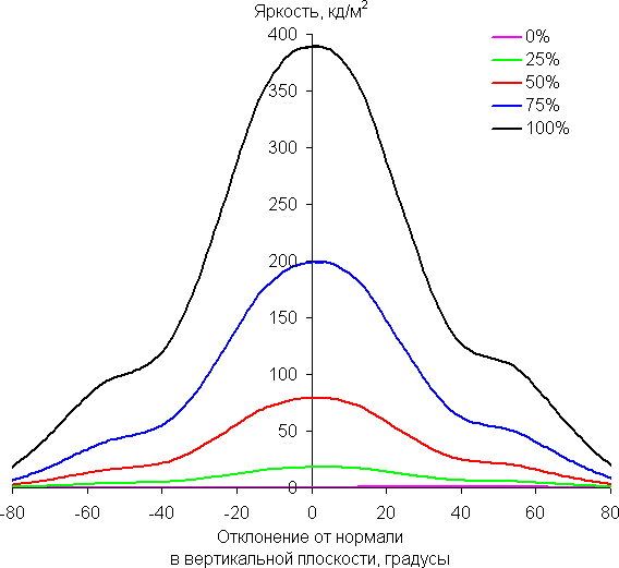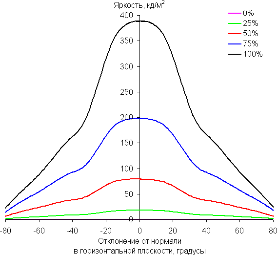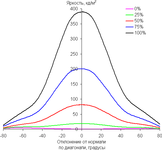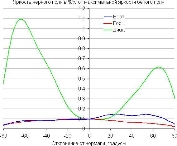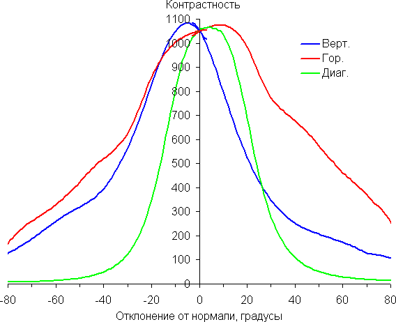 Отметим плавное, но все же относительно быстрое уменьшение яркости при небольшом отклонении от перпендикуляра к экрану во всех трех направлениях, при этом графики не пересекаются во всем диапазоне измеряемых углов. По скорости снижения яркости углы обзора относительно узкие, что для матрицы типа IPS не характерно. При отклонении в диагональном направлении яркость черного поля начинает резко возрастать уже при 20°-30° отклонения от перпендикуляра к экрану. Если сидеть не очень далеко от экрана, то черное поле по углам будет заметно светлее, чем в центре, но оставаться условно нейтрально-серым. Контрастность в диапазоне углов ±82° для двух направлений значительно превышает 10:1 и только для диагонального направления она ниже и по одной диагонали опускается за отметку 10:1 при 68°.