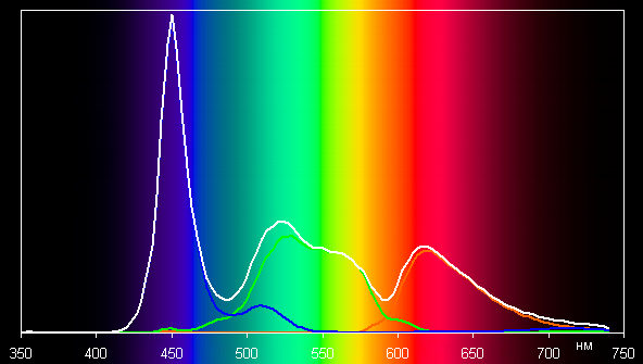 Ниже приведен спектр для белого поля (белая линия), наложенный на спектры красного, зеленого и синего полей (линии соответствующих цветов) для профиля «Широко»:
