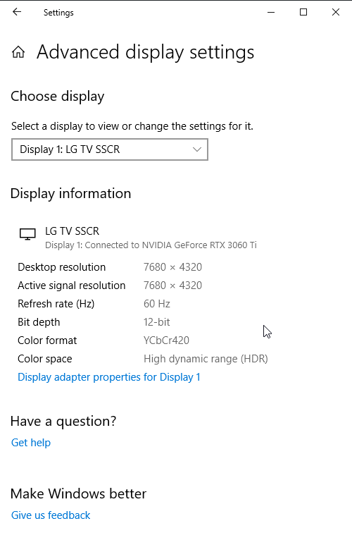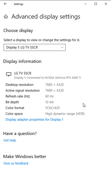 При подключении к компьютеру по HDMI вывод изображения в разрешении 7680×4320 пикселей мы получили с кадровой частотой вплоть до 60 Гц включительно, но только в режиме со снижением цветовой четкости — цветоразностное кодирование 4:2:0.