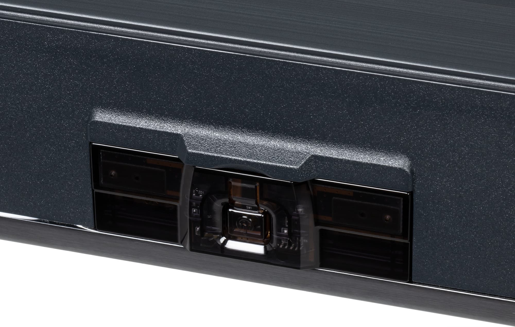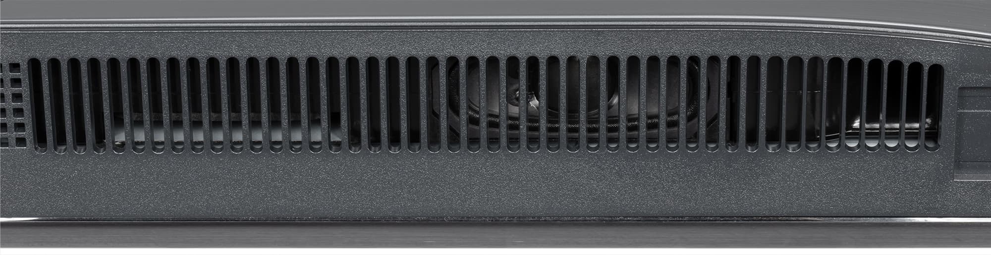 Вентиляционные решетки есть на кожухе в средней части и в верхней, а также на нижнем торце. За решетками на нижнем торце справа и слева можно рассмотреть два средне-высокочастотных громкоговорителя с вытянутыми диффузорами, а рядом — отверстия фазоинверторов или рупоров низкочастотных громкоговорителей.