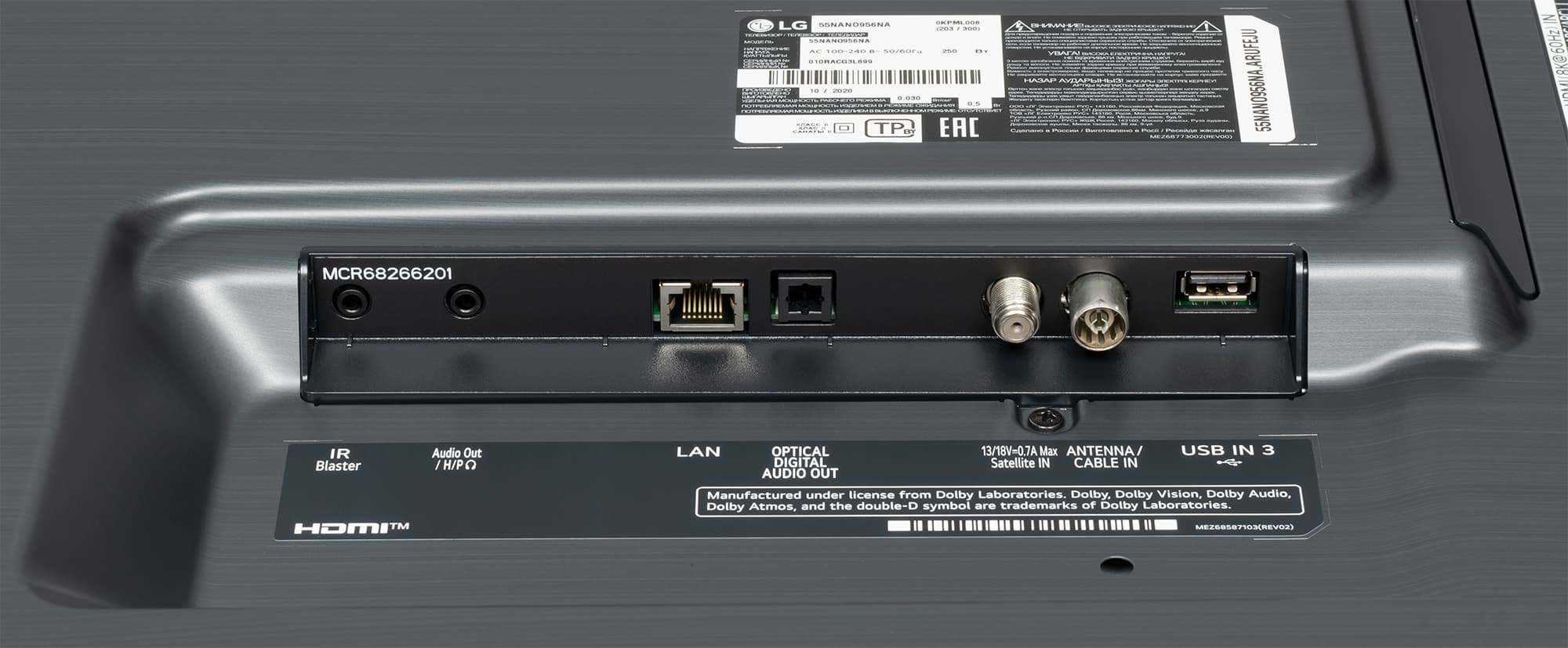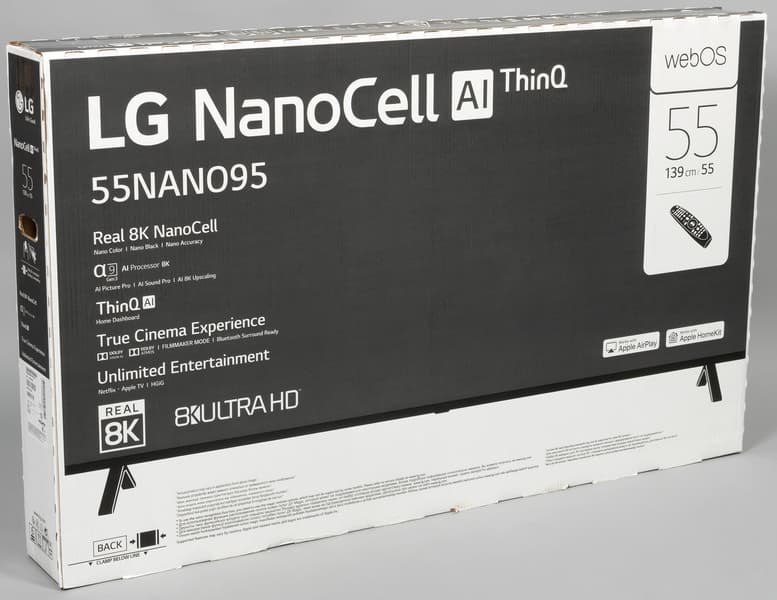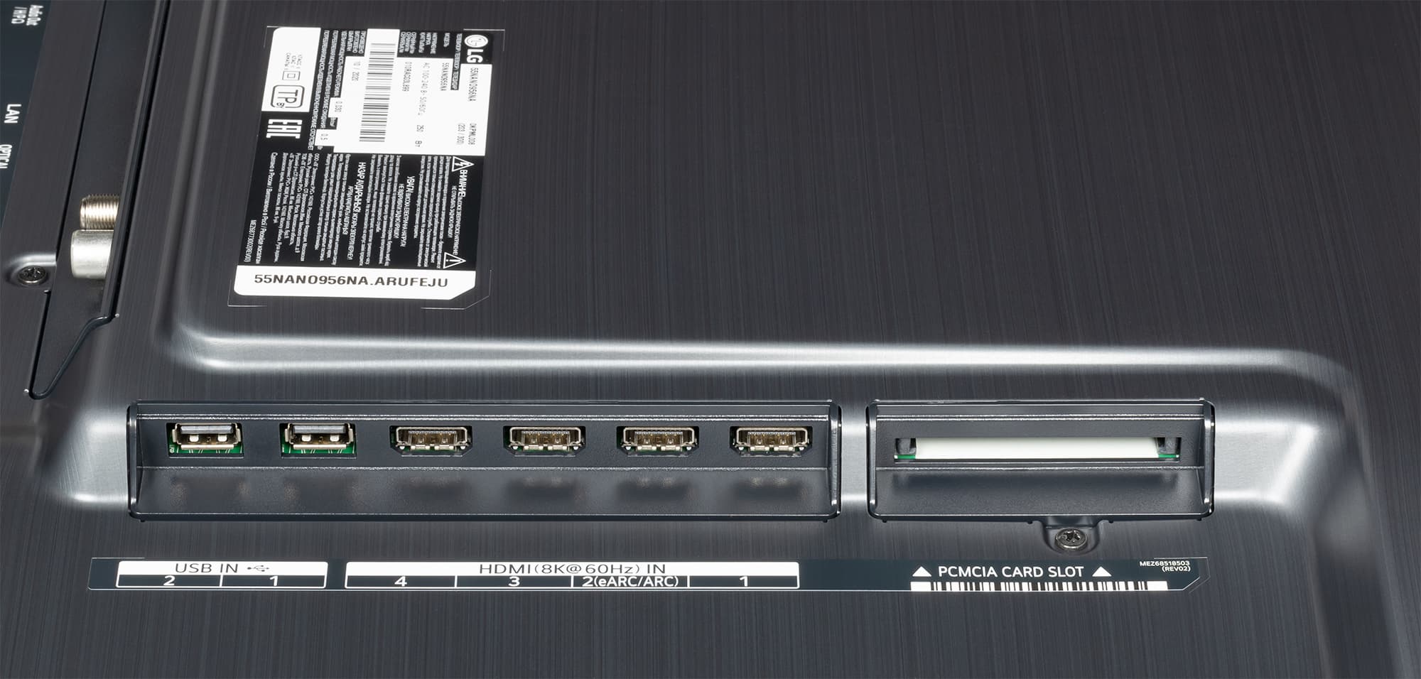 На момент написания данной статьи LG 55NANO956NA был, по всей видимости, самым доступным в России телевизором с разрешением 8К (7680×4320). Зачем нужно такое разрешение и где брать контент в разрешении 8К — это вопросы, требующие отдельного обсуждения. Просто отметим, что разглядеть отдельные точки на экране с диагональю 55 дюймов и разрешением 8К можно лишь с расстояния порядка 1 м — и это при ширине экрана примерно 1,2 м. Телевизор имеет нейтральный дизайн, не отвлекающий зрителя от происходящего на экране. Поддержка HDR хорошая, так как поддерживаются все распространенные форматы HDR (HDR10, HLG и Dolby Vision), есть качественный вывод 10-битного цвета, присутствует локальное затемнение и на небольших участках пиковая яркость может достигать высоких значений. Для полноценной поддержки HDR не хватает только широкого цветового охвата — по факту он всего лишь немного шире, чем sRGB. Набор мультимедийных функций и оснащенность интерфейсами у данного телевизора соответствует тому, что можно встретить в других топовых моделях телевизоров LG. Данный ТВ можно рекомендовать для просмотра телепередач и фильмов, а также для игр, но использование в качестве компьютерного монитора для работы с текстами, изображениями и т. д. в силу ряда причин не рекомендуется. Далее списками: