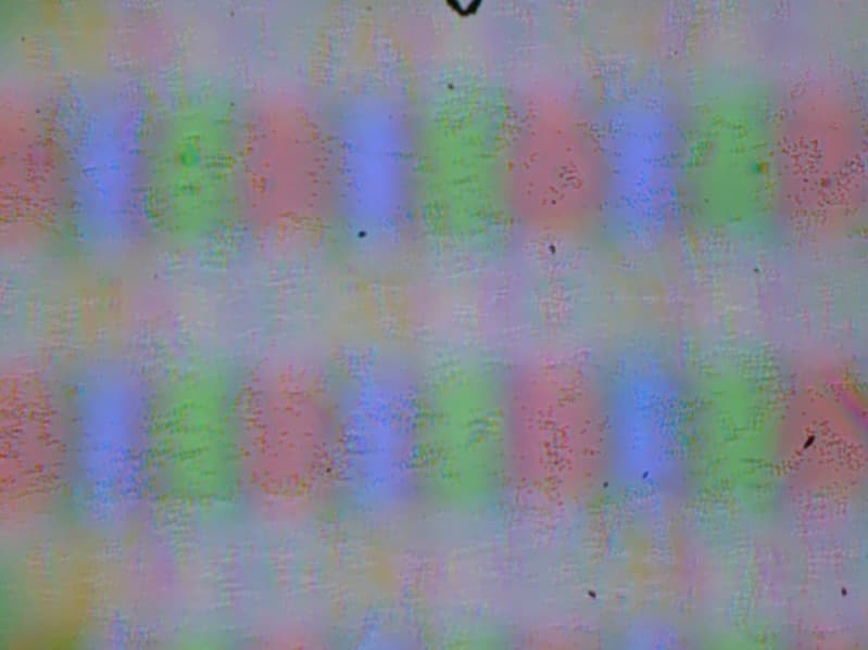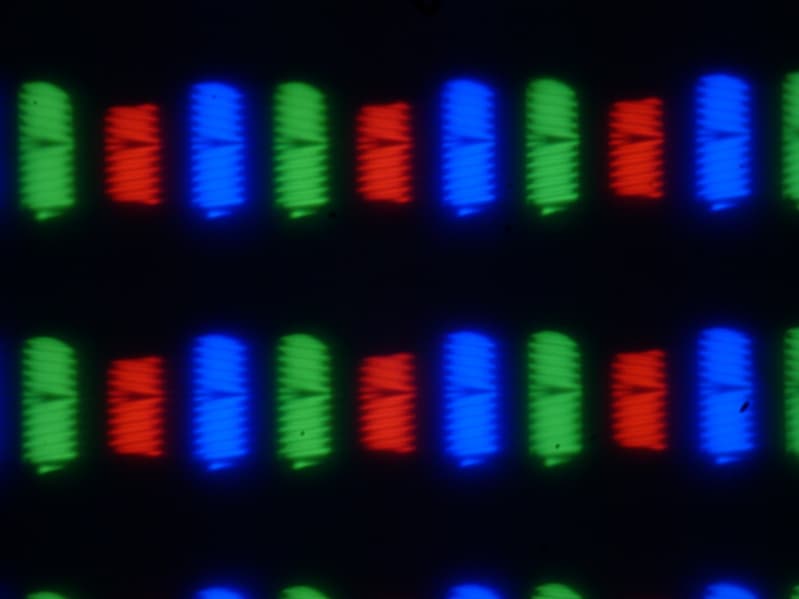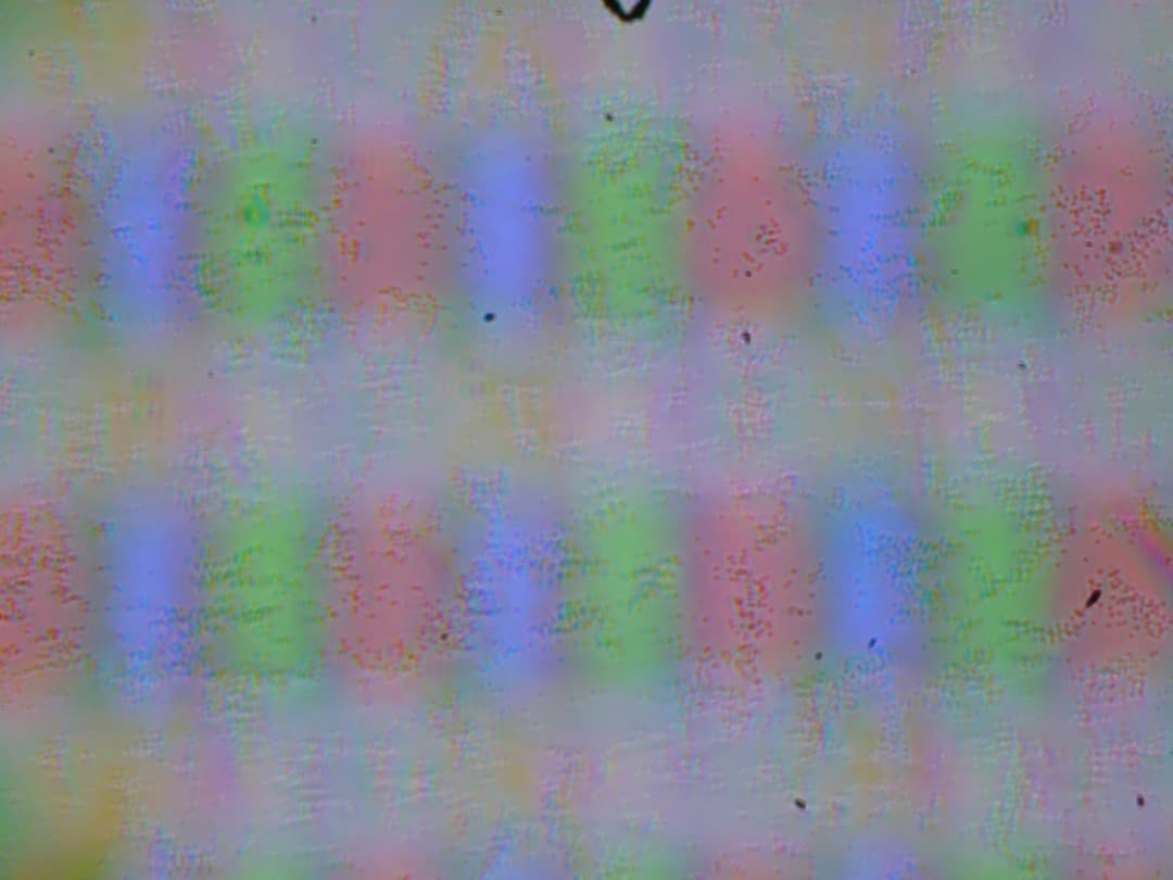 Согласно паспортным характеристикам, в данном телевизоре установлена матрица типа IPS. Микрофотографии не противоречат этому (черные точки — это пыль на матрице фотоаппарата):