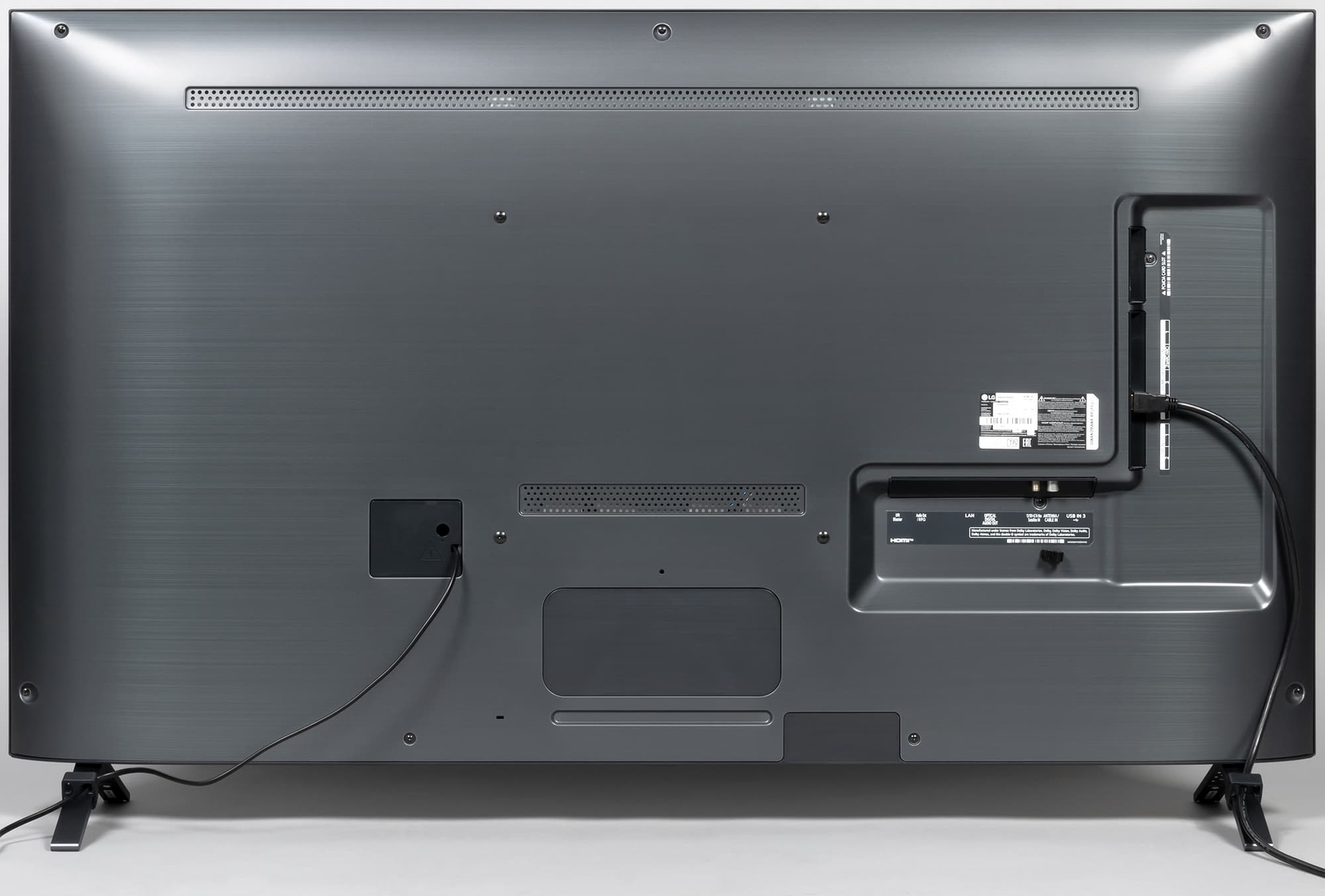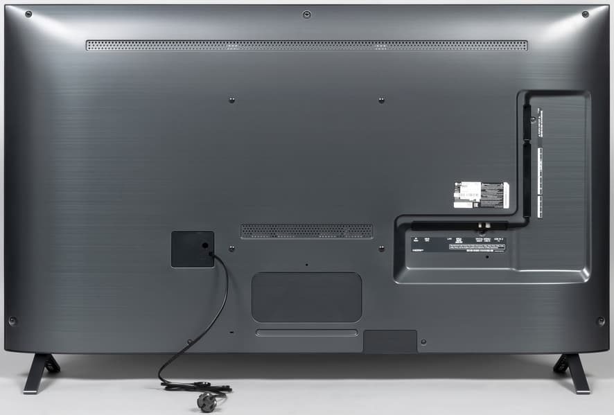 Кожух сзади изготовлен из тонкого листа стали и имеет черное матовое покрытие. Широкий нижний торец — из черного пластика с матовой поверхностью. Телевизор относительно тонкий.