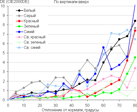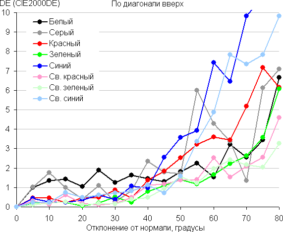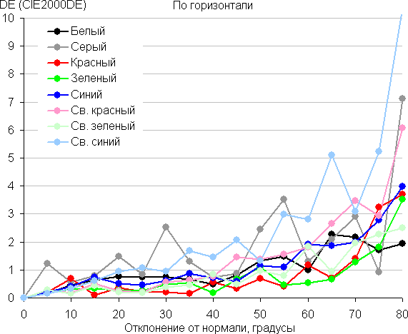 Для количественной характеристики изменения цветопередачи мы провели колориметрические измерения для белого, серого (127, 127, 127), красного, зеленого и синего, а также светло-красного, светло-зеленого и светло-синего полей во весь экран с использованием установки, подобной той, что применялась в предыдущем тесте. Измерения проводились в диапазоне углов от 0° (датчик направлен перпендикулярно к экрану) до 80° с шагом в 5°. Полученные значения интенсивностей были пересчитаны в отклонение ΔE относительно замера каждого поля при перпендикулярном положении датчика относительно экрана. Результаты представлены ниже: