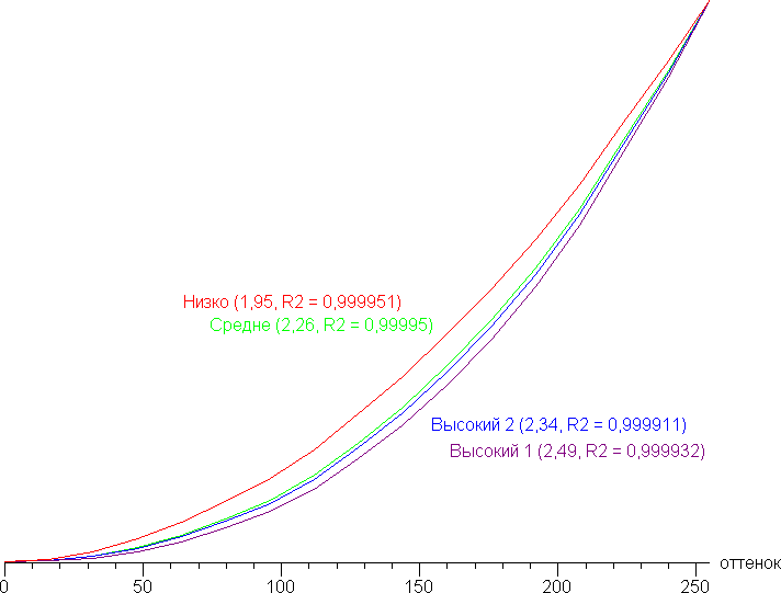 Для оценки характера роста яркости на шкале серого мы измерили яркость 17 оттенков серого при различных значениях параметра Гамма. На графике ниже приведены полученные гамма-кривые (значения показателей аппроксимирующей функции приведены в скобках в подписях, там же — коэффициент детерминации):