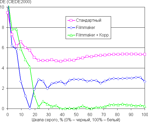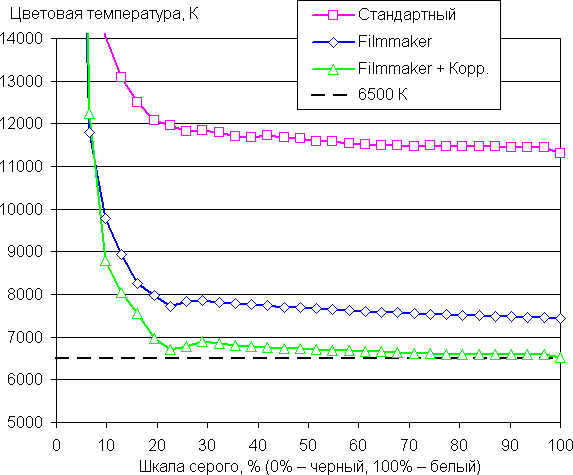В самом ярком варианте цветовая температура великовата (режим Стандартный, Цвет. темп-ра = 0), но, например, в режиме Filmmaker цветовая температура ниже, и, при желании, цветовой баланс можно скорректировать, например, настройками интенсивности трех основных цветов (мы установили их на Красный = 0, Зеленый = −18, Синий = −28). Графики ниже показывают цветовую температуру на различных участках шкалы серого и отклонение от спектра абсолютно черного тела (параметр ΔE), полученные для этих трех случаев: