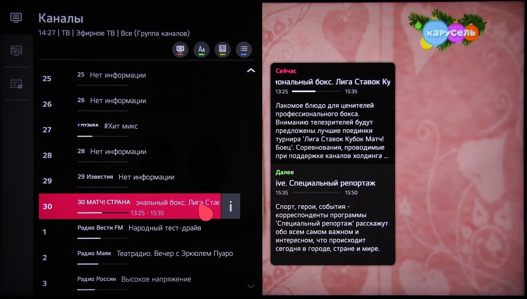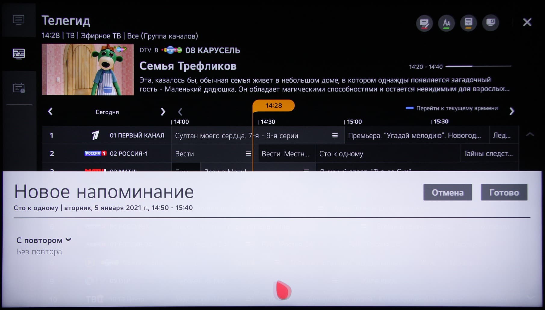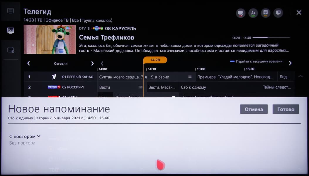 Есть хорошая поддержка электронной программы передач — можно посмотреть, что именно идет на текущем и других каналах и запрограммировать просмотр.