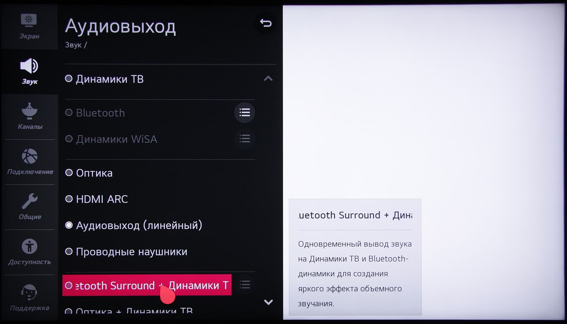 Внешнюю акустику к телевизору также можно подключать по Bluetooth. Для проверки мы успешно подключились к нашей тестовой беспроводной колонке Sven PS-200BL. При этом до двух Bluetooth-колонок могут использоваться совместно с громкоговорителями телевизора для создания окружающего многоканального звучания.