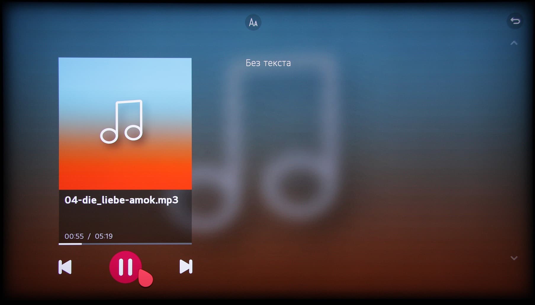 В случае аудиофайлов поддерживаются множество распространенных и не очень форматов, как минимум AAC, MP3, OGG, WMA (в т.ч. со сжатием без потерь и с 24 бит), M4A, WAV и FLAC (расширение должно быть именно FLAC). Поддерживаются тэги как минимум в MP3 и OGG, картинки-обложки в MP3 и тексты песен в тех же MP3. Есть функция поиска, в том числе по тэгам. В результатах поиска будет выдача контента потоковых сервисов и локальное содержимое. Работа со списками и собственно плеер выглядят как два независимых приложения (и, скорее всего, ими и являются). Экран ТВ можно отключить на время воспроизведения аудиофайлов, а плеер свернуть до круглого значка или наоборот, развернуть на весь экран, чтобы, например, увидеть текст песни.
