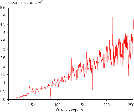 Реальная гамма-кривая ближе к стандартной в случае варианта Средне, поэтому далее мы измерили яркость 256 оттенков серого (от 0, 0, 0 до 255, 255, 255) при этом значении. График ниже показывает прирост (не абсолютное значение!) яркости между соседними полутонами:
