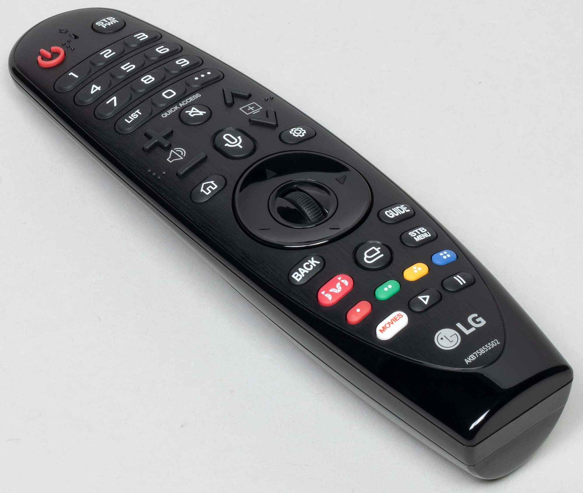 К телевизору прилагается пульт серии Magic (модель MR20GA). Корпус пульта изготовлен в основном из черного пластика, а частично — из прозрачного, но плотно тонированного красным пластика, прозрачного для ИК. Благодаря особой форме пульт удобно лежит в руке. Его можно положить или поставить на попа.