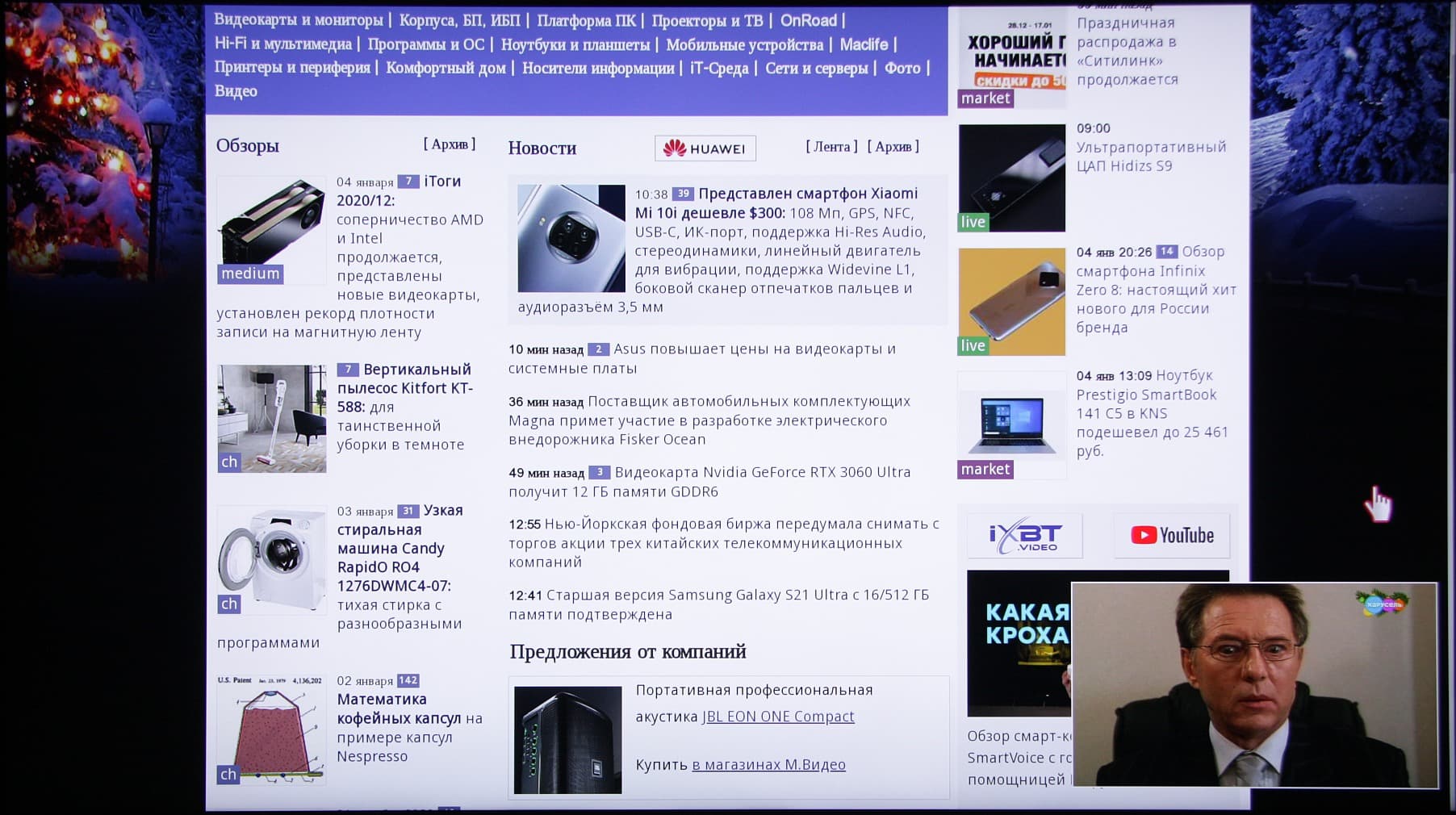 Встроенный браузер по интернету хорошо справился с показом главной страницы iXBT.com и содержимого статей. Но страницы отрисовываются в разрешении 1920×1080. Интересная функция браузера — отображение в левой половине экрана видео от текущего источника. При этом пользователь может быстро переключиться на полноэкранный вывод видео или загнать его в небольшое окошко, которое можно переместить в нужное место на экране.