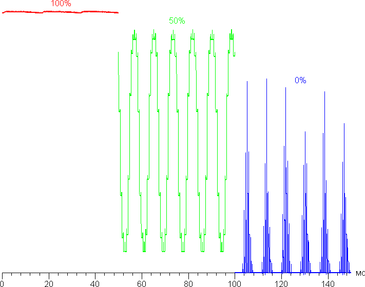 На графиках зависимости яркости (вертикальная ось) от времени (горизонтальная ось) в случае средней и низкой яркости подсветки обнаруживается значимая модуляция с основной частотой 120 Гц:
