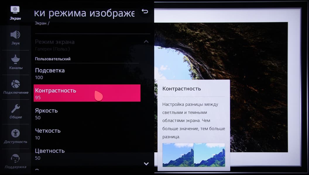Меню с настройками ТВ занимает большую часть экрана, надписи в нем читаемые. Есть русифицированный вариант интерфейса. Качество перевода хорошее, и самое главное, что настройки в большинстве случаев меняют именно то, что ожидаешь, исходя из их наименования.