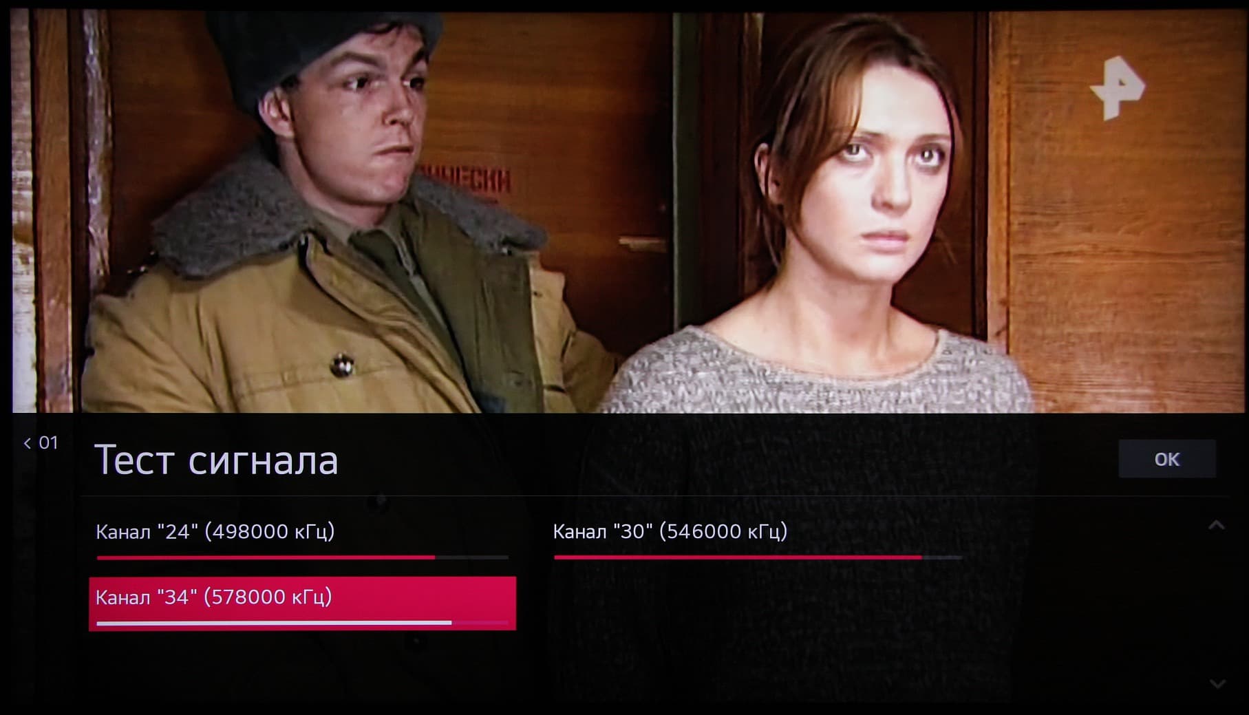 Данная модель, помимо спутникового тюнера, оснащена тюнером, принимающим аналоговый и цифровой сигнал эфирного и кабельного вещания. Качество приема цифровых каналов на дециметровую антенну, закрепленную на стене здания (почти прямая видимость в направлении на телевышку в Бутово, расположенную на расстоянии 14 км), было на высоком уровне — удалось найти ТВ-каналы во всех трех мультиплексах (всего 30, плюс 3 канала радио).