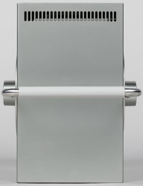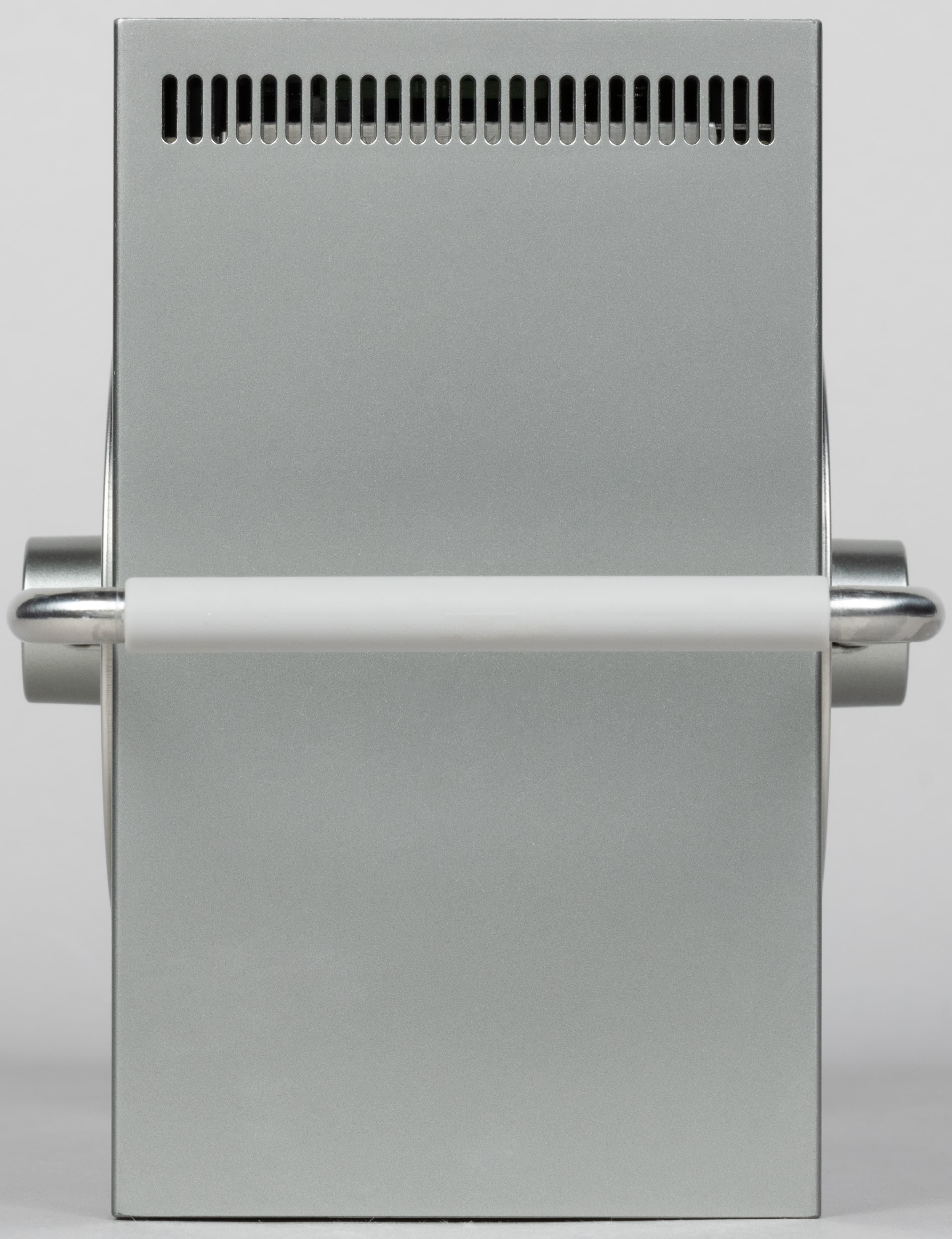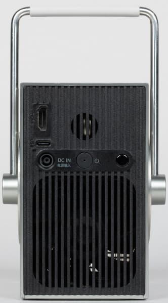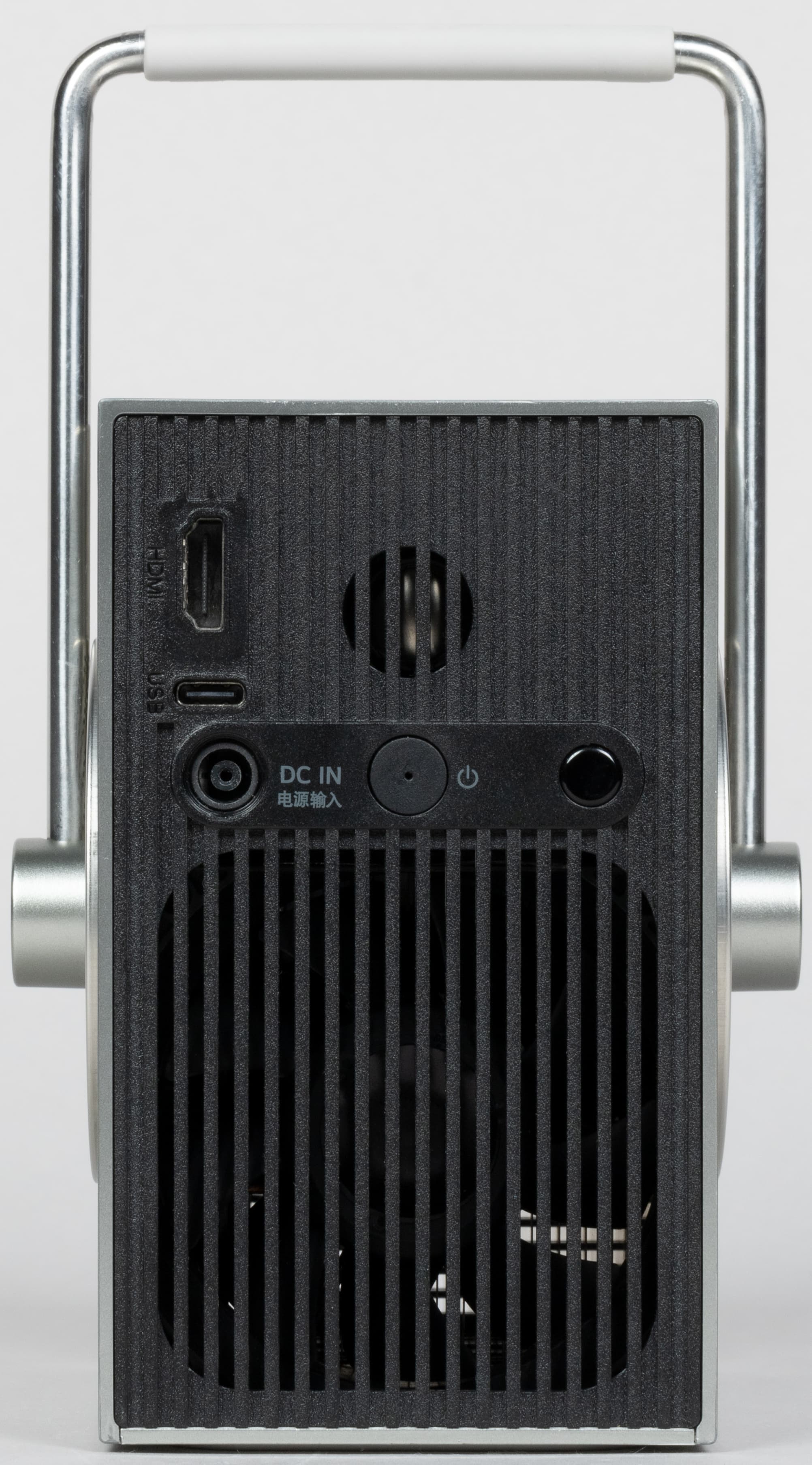 Если кратко охарактеризовать внешний вид этого проектора, то можно применить словосочетание «кубик с ручкой». Изготовленная из нержавеющей стали ручка-скоба с усилием вращается вокруг корпуса проектора на 360 градусов и, за счет усилия, фиксируется в любом положении. Короткий сегмент ручки обрезинен. За ручку проектор удобно переносить, также она может служить опорой, позволяющей направить проекцию вверх.