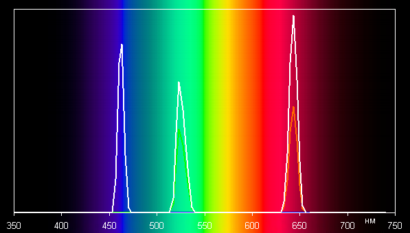 Видно, что цвета очень хорошо разделены, и перекрестное подмешивание цветов минимальное. Узкие пики подтверждают сведения о лазерных источниках света.