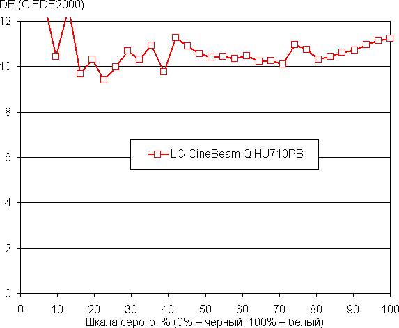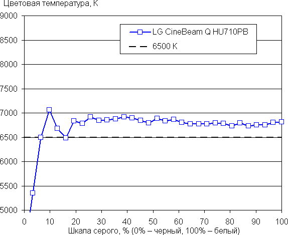 Близкий к черному диапазон можно не учитывать, так как в нем цветопередача не так важна, а погрешность измерения цветовых характеристик высокая. Видно, что в этом режиме с учетом возможного влияния полотна экрана цветопередача приемлемая, так как ΔE не сильно выше 10, а цветовая температура довольно близка к стандартным 6500 К, при этом оба параметра мало изменяются на различных участках шкалы серого, что улучшает визуальное восприятие цветового баланса. При желании, тонкую коррекцию цветового баланса нужно выполнять индивидуально под конкретный экран.