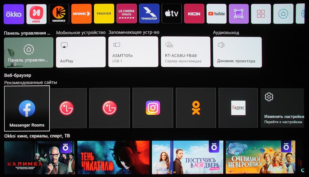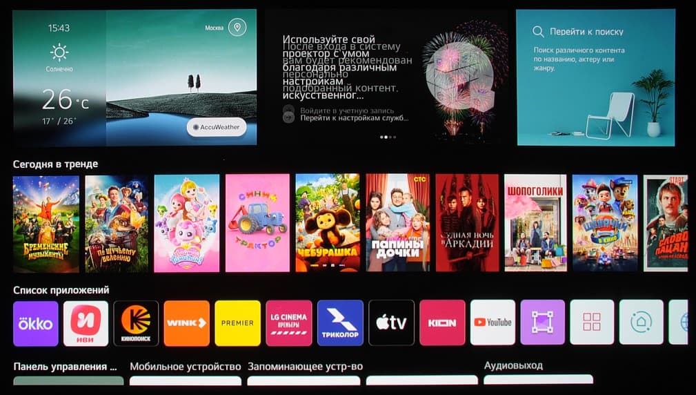 Программной платформой для этого проектора служит операционная система webOS Smart TV (в данном случае версии 6.0), основанная на ядре Linux. Заглавная страница интерфейса организована в виде горизонтальных лент с плитками. Если содержимое ленты не помещается на экране, то ее можно прокрутить. Вверху на заглавной странице интерфейса расположены три большие плитки — погода, рекомендованные действия и поиск, — чуть ниже находятся плитки-обложки рекомендованного контента, далее лента с небольшими квадратными значками установленных приложений (большинство из которых можно переместить по ленте или удалить), ниже — лента с плитками, среди которых есть подключенные устройства и активные входы, и еще ниже снова плитки-обложки рекомендованного контента, сгруппированные по приложениям-источникам.