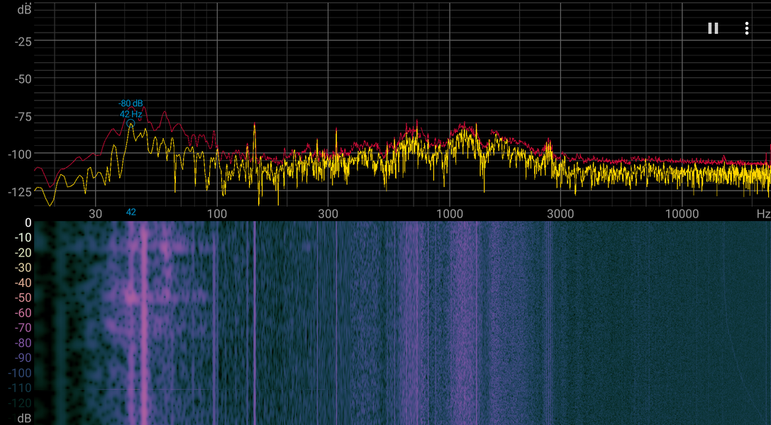 Спектрограмма (получена для варианта Минимум из таблицы выше) не идеально ровная, есть несколько неинтенсивных пиков, но в целом характер звука дискомфорта не доставляет.