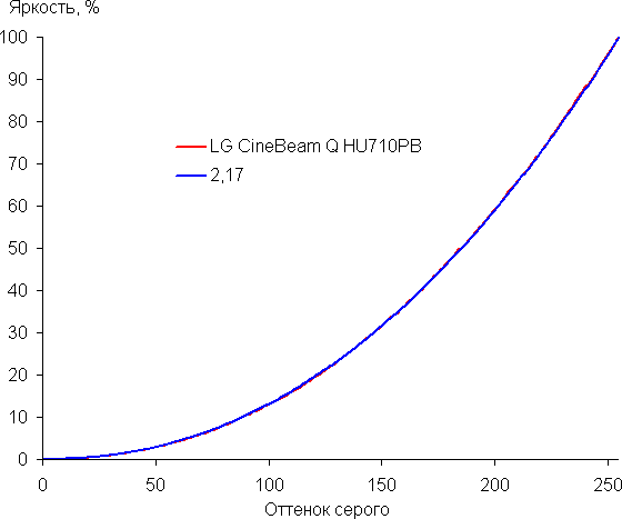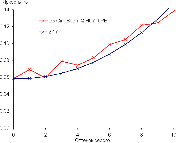 Аппроксимация полученной по 256 точкам гамма-кривой дала значение показателя 2,17, что близко к стандартному значению 2,2, при этом реальная гамма-кривая мало отклоняется от аппроксимирующей функции: