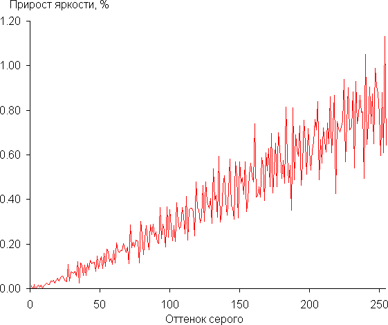 Для оценки характера роста яркости на шкале серого мы измерили яркость яркость 256 оттенков серого (от 0, 0, 0 до 255, 255, 255) для случая Гамма = 2.2. График ниже показывает прирост (не абсолютное значение!) яркости между соседними полутонами: