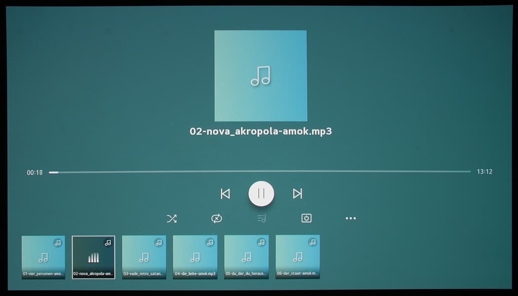 Вывод изображения (но не источник света) можно отключить на время воспроизведения аудиофайлов. Навигация по носителю выполняется фактически с помощью отдельного приложения, поэтому она не влияет на работу плеера, и только после выбора нужного файла он запускается на воспроизведение.