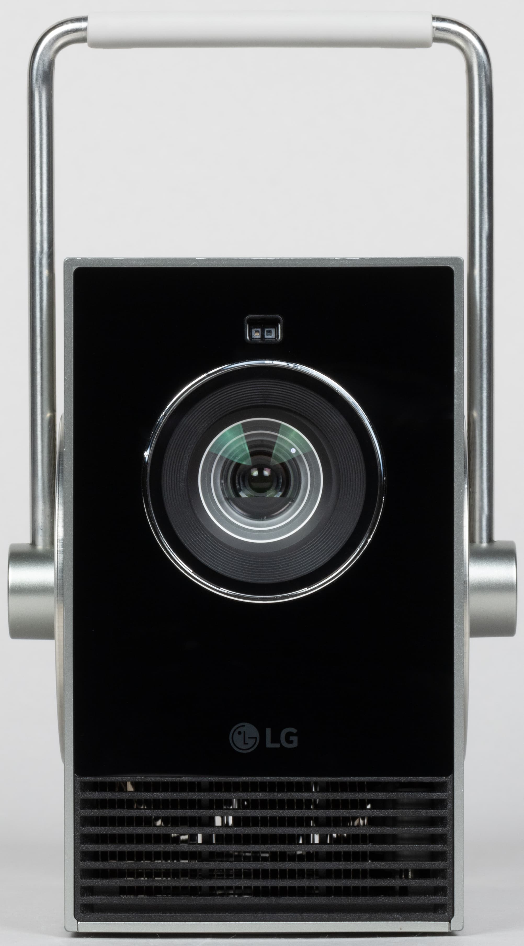 Вперед смотрит объектив, закрытый защитным стеклом. Над объективом расположен датчик, с помощью которого выполняется автоматическая фокусировка и коррекция геометрии проекции. В нижней части — выпускная вентиляционная решетка.