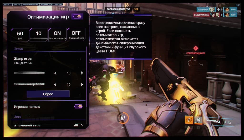 Мы определяли полную задержку вывода от переключения страниц видеобуфера до начала вывода изображения на экран. Задержка вывода самая низкая в режиме Оптимизация игр, но даже в этом случае для сигнала 2160p при 60 Гц кадровой частоты она равна примерно 50 мс. Такая задержка будет чувствоваться в очень динамичных играх, но просто при работе за компьютером ее наличие почти незаметно.