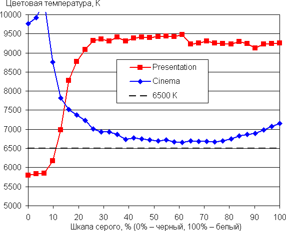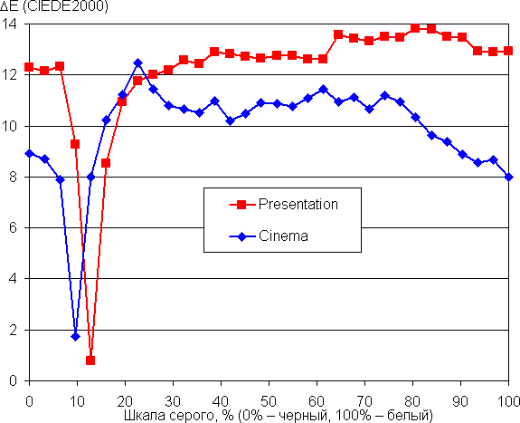 Графики ниже показывают цветовую температуру на различных участках шкалы серого и отклонение от спектра абсолютно черного тела (параметр ΔE) для самого сбалансированного по цветам предустановленного режима Cinema и для самого яркого режима Presentation: