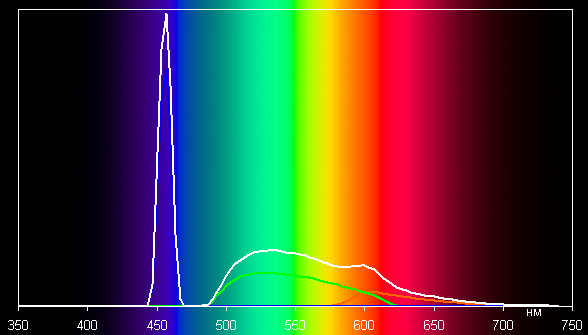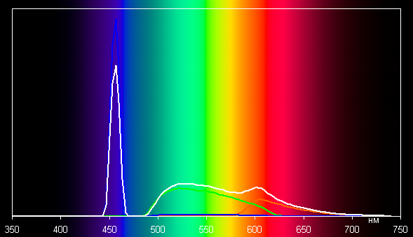 Видно, что красный и зеленый цвета разделены слабо, а в случае синего пик очень узкий, что характерно для лазерного излучения. Спектр белого всегда выше спектров чистых цветов, что приводит к дисбалансу яркости чистых цветов относительно яркости белого цвета.