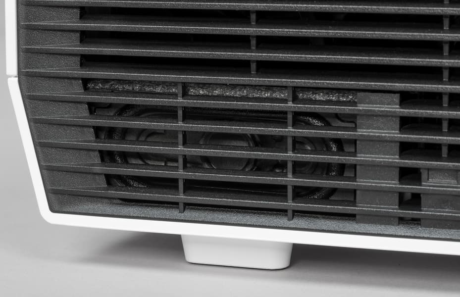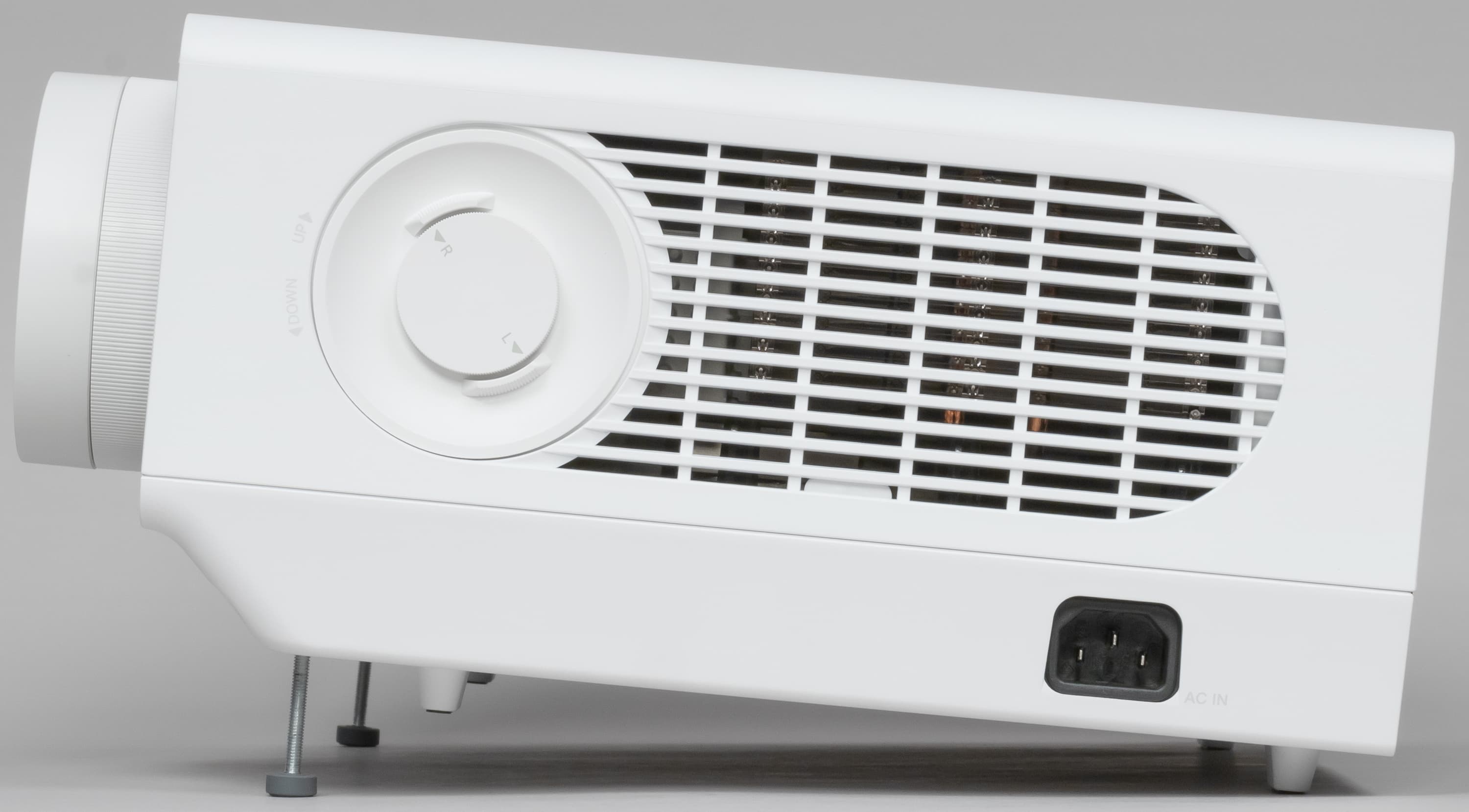 Дизайн проектора можно назвать классическим в варианте с несимметричным расположением объектива. Корпус проектора изготовлен из пластика. Верхняя и нижняя части с заходом на боковые поверхности имеют белое матовое покрытие, а покрытие панелей-решеток спереди и сзади — черное матовое. В целом корпус немаркий, и покрытие относительно устойчиво к появлению царапин. Воздух для охлаждения внутренностей забирается через решетки спереди, за которыми можно рассмотреть два больших вентилятора, и на левом боку.