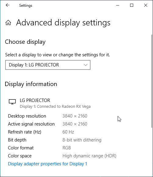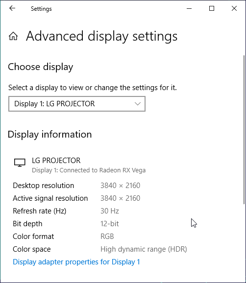 Под Windows 10 вывод в режиме HDR на данный проектор возможен при выборе соответствующих опций в настройках дисплея. При разрешении 4К и 60 Гц вывод идет в режиме 8 бит на цвет, дополненных динамическим смешением цветов, видимо, с помощью видеокарты на аппаратном уровне. При 30 Гц — 12 бит на цвет.