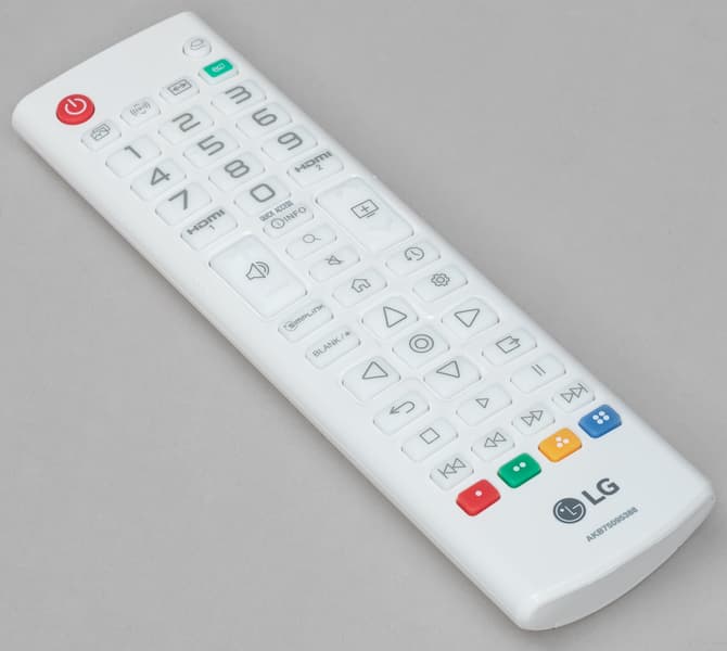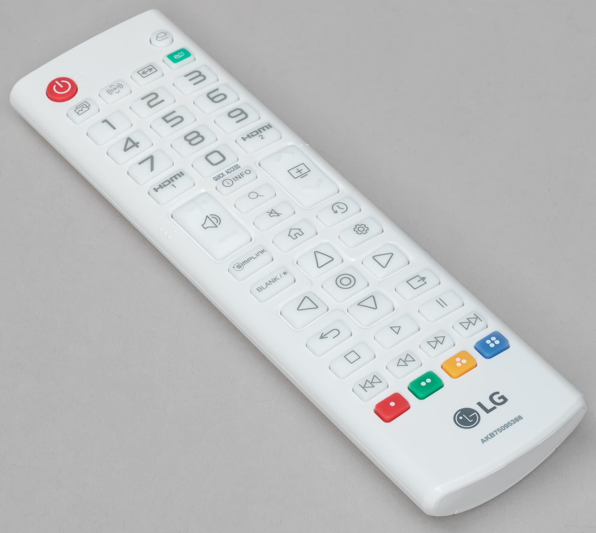 Пульт, к сожалению, обычный, а не серии Magic с функцией координатного ввода, которым часто комплектуются «умные» проекторы и телевизоры LG. Корпус ИК-пульта дистанционного управления изготовлен из белого пластика с матовой поверхностью. Пульт относительно большой, надписи/значки часто используемых кнопок читаются хорошо, но кнопок много, даже излишне много, расположены они тесно и большинство плохо различаются на ощупь, к тому же подсветки кнопок нет. В итоге пользоваться пультом неудобно.
