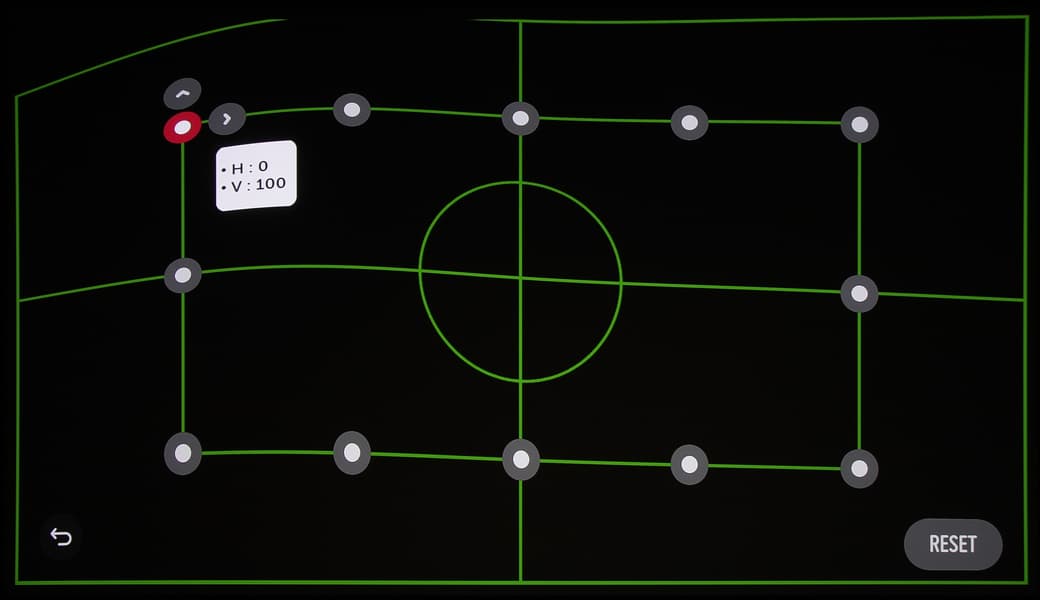 Два соосных воротка сбоку позволяют смещать границы проекции так, что картинка смещается максимум на 50% от высоты проекции вверх и вниз по вертикали и на 20% от ширины проекции вправо и влево по горизонтали (данные из руководства). При смещении по вертикали от центрального положения диапазон по горизонтали сужается и наоборот. Есть продвинутый режим ручной коррекции геометрии по 12 точкам.