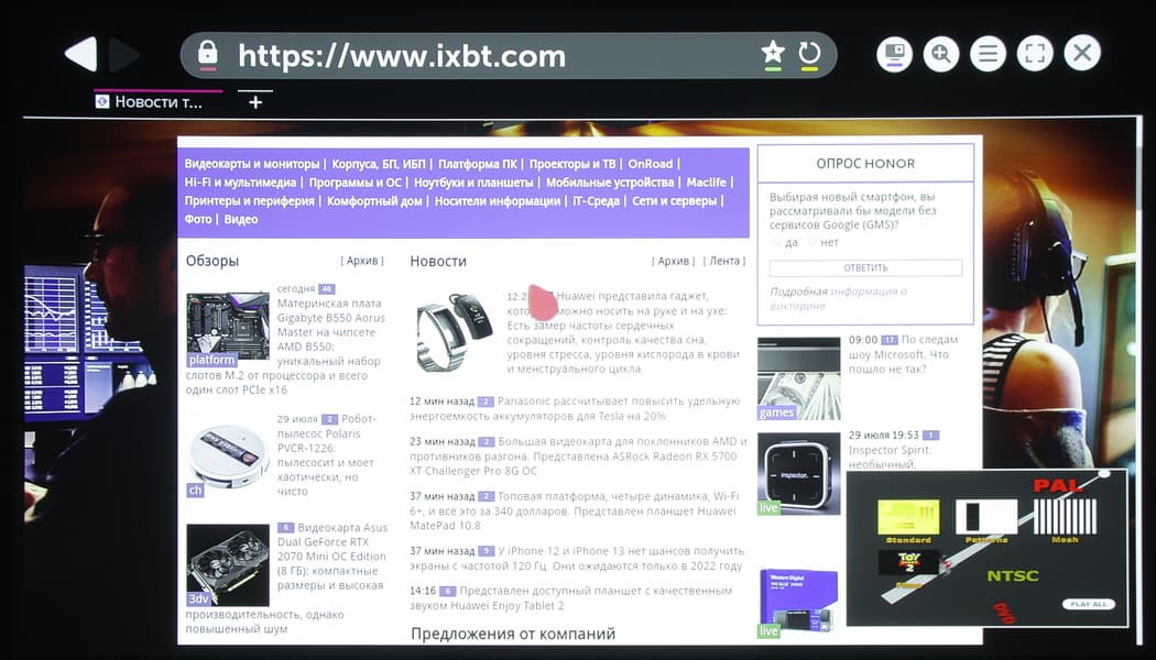 Магазина приложений и контента нет, и это, с нашей точки зрения, основное отличие версий non-Smart от Smart TV. Встроенный браузер по интернету имеет довольно продвинутую функциональность, в частности он хорошо справился с показом главной страницы iXBT.com и содержимого статей. Особая «фишка» браузера — отображения в небольшом окошке видео от текущего источника.