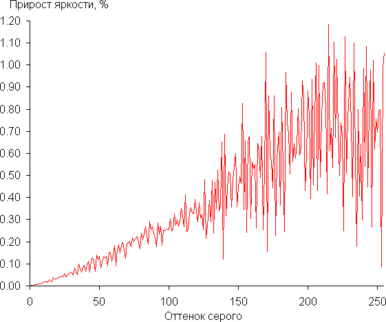 Значения показателей аппроксимирующей функции приведены в скобках в подписях, там же — коэффициент детерминации, чем он выше, тем ближе реальная кривая к степенной функции. Далее мы измерили яркость 256 оттенков серого (от 0, 0, 0 до 255, 255, 255) для случая Gamma = 2.4. График ниже показывает прирост (не абсолютное значение!) яркости между соседними полутонами: