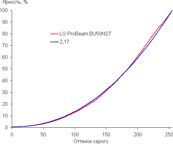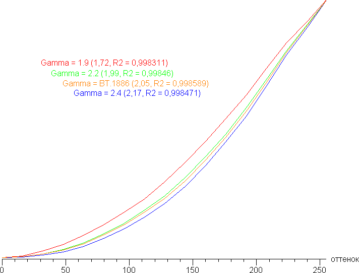 Аппроксимация полученной по 256 точкам гамма-кривой дала значение показателя 2,17, что близко к стандартному значению 2,2, но этом реальная гамма-кривая местами отклоняется от аппроксимирующей функции: