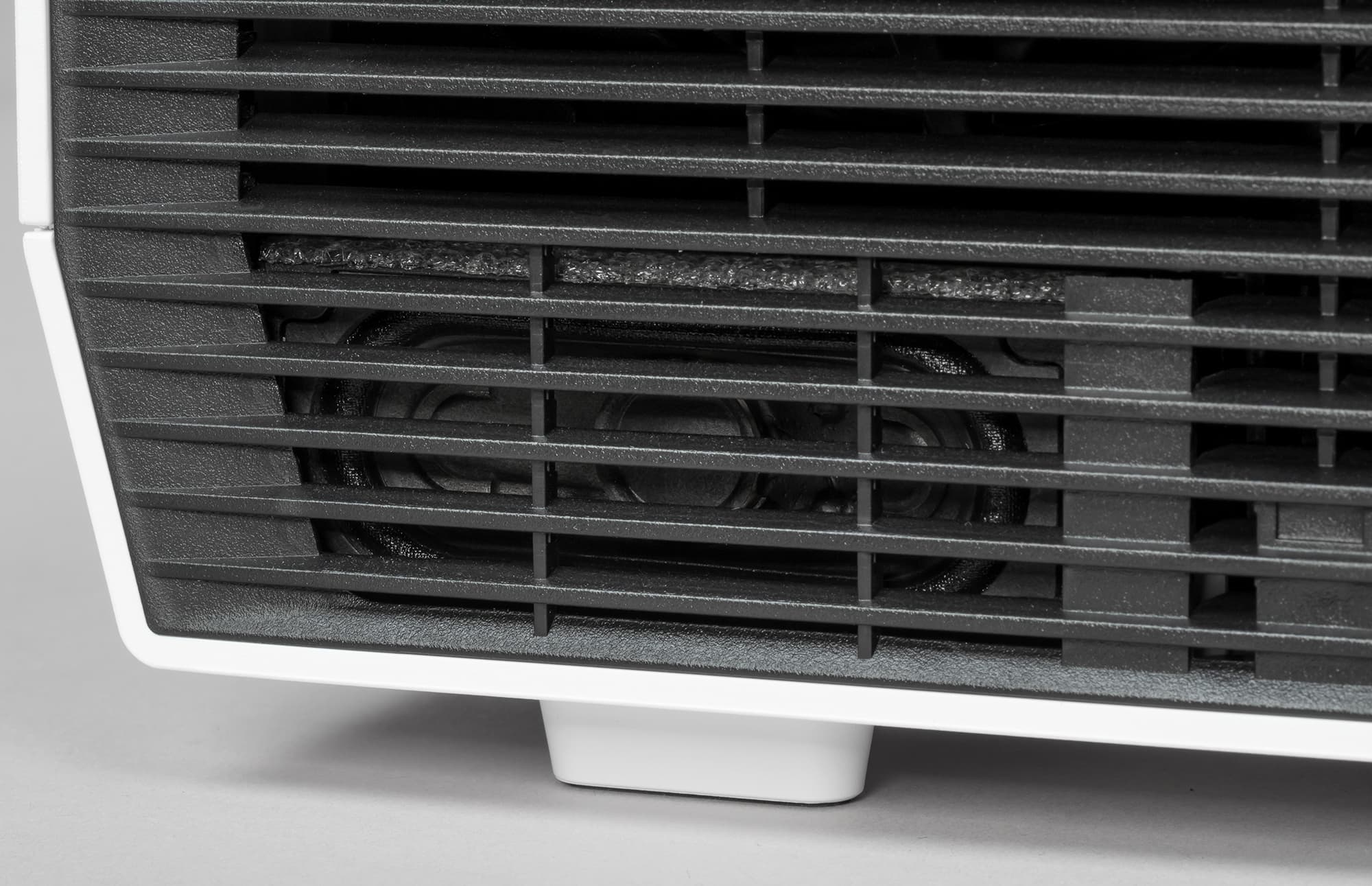 Спереди в правом нижнем углу можно обнаружить окошко ИК-приемника, а над ним — крохотный индикатор состояния (в режиме ожидания он неярко светится красным). Выдувается воздух назад — три больших вентилятора за решеткой.