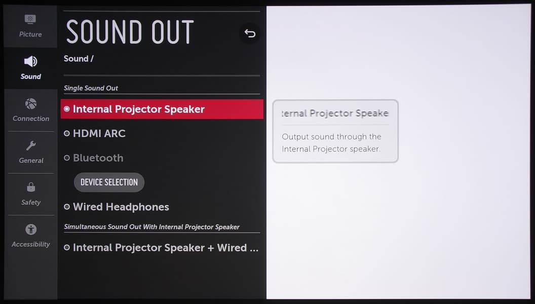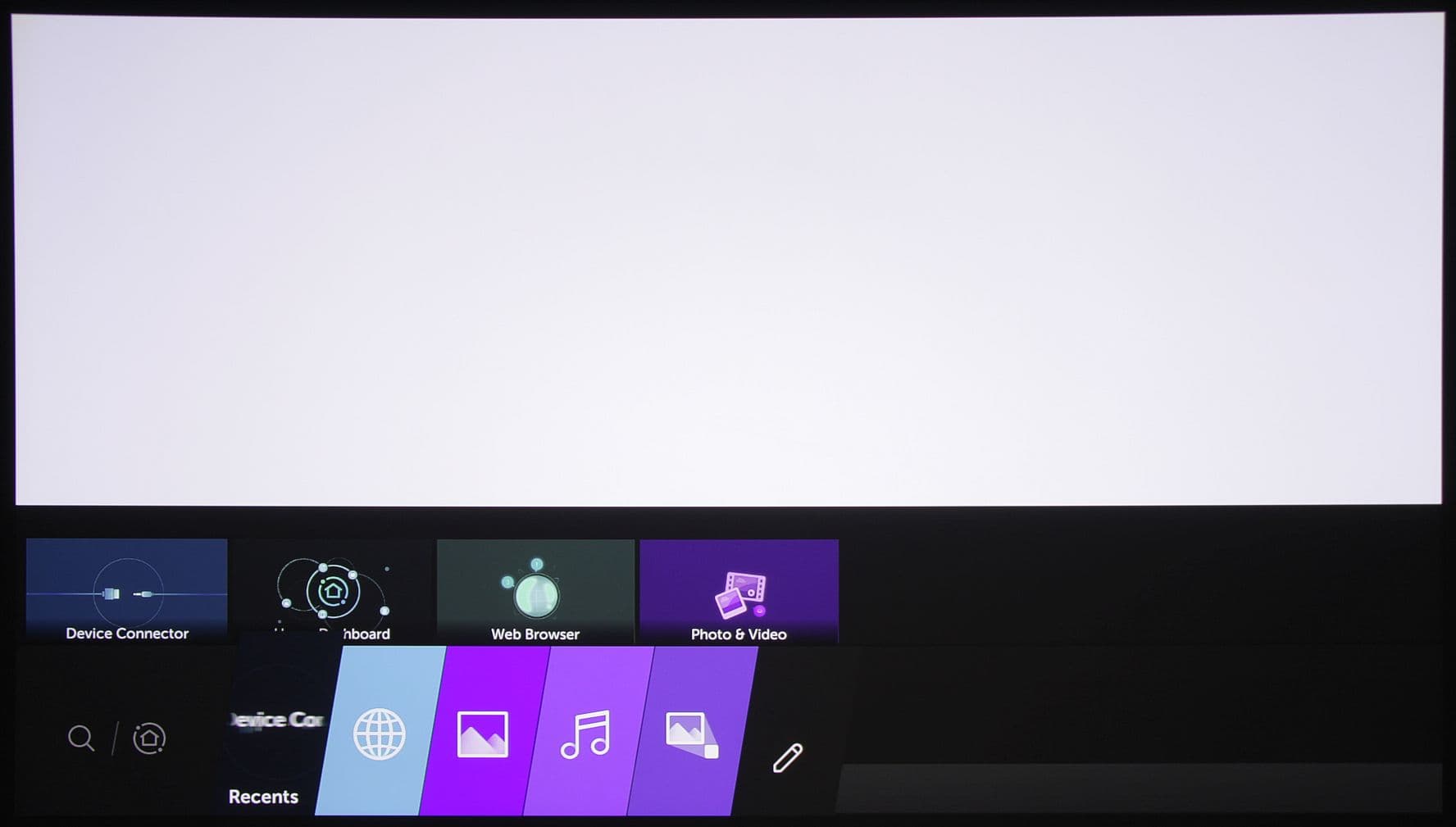 К проектору по USB можно подключить клавиатуру и мышь (подключение по Bluetooth поддерживается только для каких-то избранных клавиатур LG). Эти устройства ввода, как и любая опробованная нами USB-периферия работают через USB-разветвитель, освобождая дефицитные USB-порты под другие задачи. С проводными и беспроводными клавиатурами и мышами от разных производителей не возникло никаких проблем. Поддерживается прокрутка колесиком, а задержка перемещения курсора мыши относительно движения самой мышью минимальная. Для подключенной клавиатуры можно выбрать альтернативную раскладку, в том числе и кириллическую самого распространенного варианта, при этом поддерживается смена раскладки клавиатуры (сочетанием клавиш Ctrl и пробел) на основную (английскую) и обратно на выбранную. Некоторые клавиши клавиатуры из основного и дополнительного мультимедийного набора напрямую вызывают ряд функций (громкость больше/меньше, включение/выключение звука, запуск поиска, вызов меню с приложениями — и все!). Нужно отметить, что в целом интерфейс хорошо оптимизирован для использования только кнопок пульта ДУ, то есть пользоваться мышью пульта или подключать клавиатуру и мышь, в общем-то, не обязательно. Нажатие на кнопку питания на пульте сразу выключает проектор. При работе проектора отклонение джойстика вправо-влево регулирует громкость звука, а нажатие выводит на экран короткое стартовое меню, из которого можно выйти, выключить проектор, перейти в выбору источника или к настройке проектора.