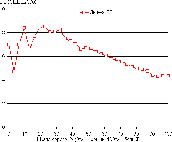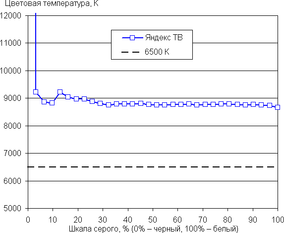 Самый близкий к черному диапазон можно не учитывать, так как в нем цветопередача не так важна, а погрешность измерения цветовых характеристик высокая. Оба параметра мало изменяется от оттенка к оттенку на значимой части шкалы серого — это положительно сказывается на визуальной оценке цветового баланса. Можно выбрать профиль Теплый, тогда цветовая температура станет ближе к стандартным 6500 К, однако при этом снижается максимальная яркость (до 255 кд/м²), соответственно снижается и контрастность.