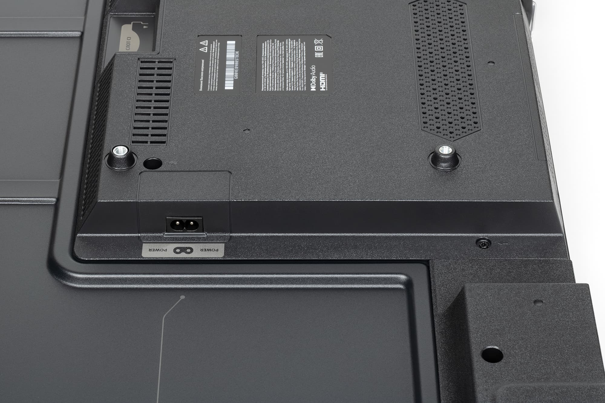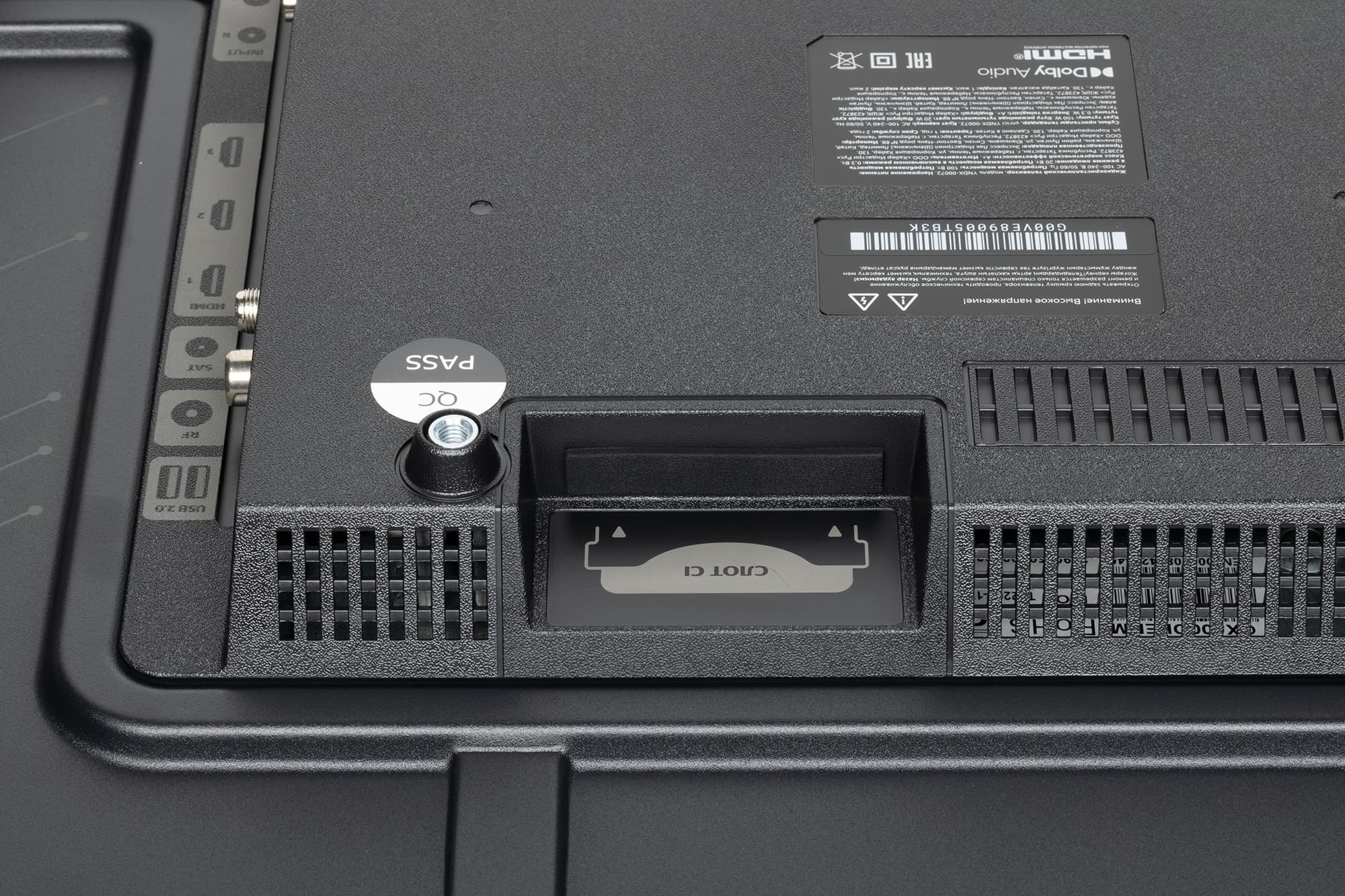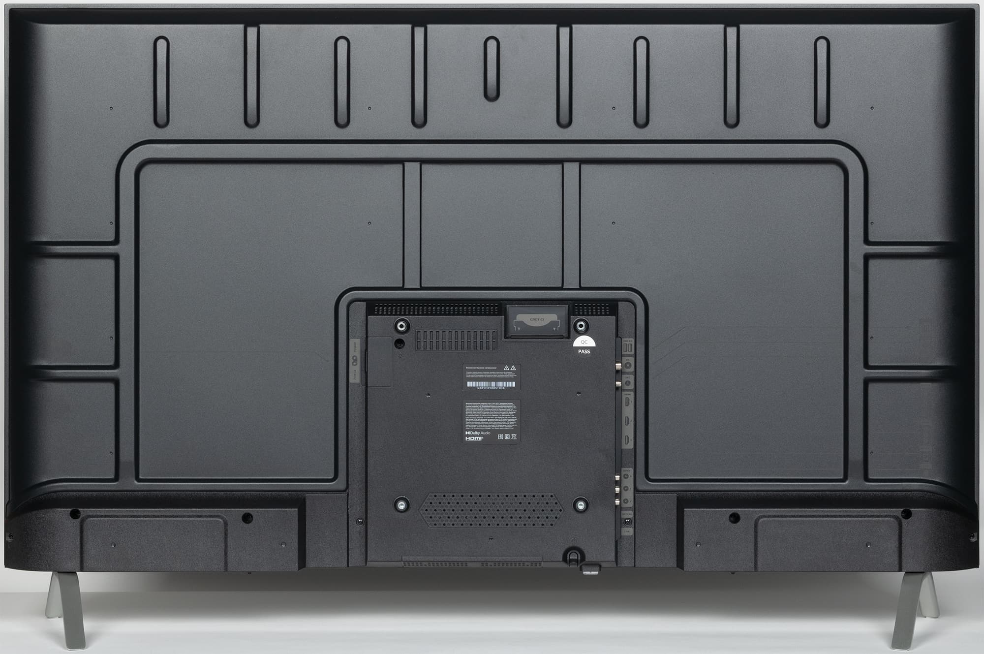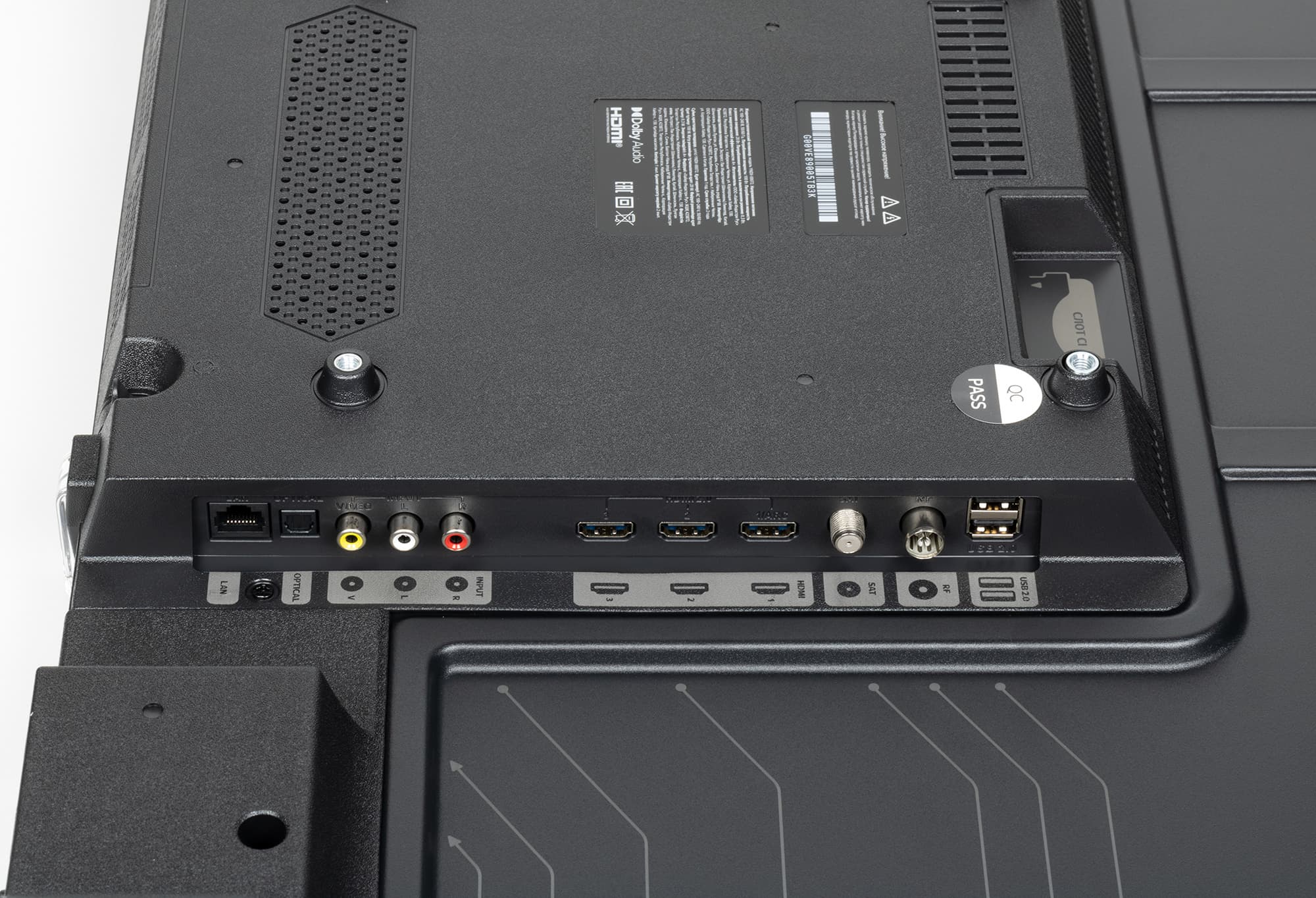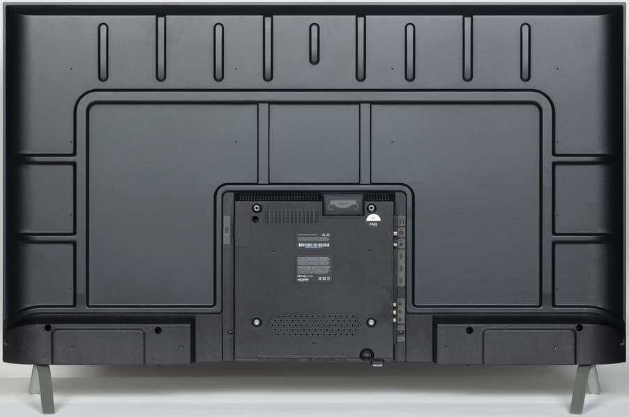 Задняя панель условно в верхней части изготовлена из тонкого листа стали и имеет стойкое черное матовое покрытие. Сверху и с боков панель заходит на торцы и образует окантовку экрана. Выступающий назад кожух в нижней части с заходом на нижний торец изготовлен из черного пластика с матовой поверхностью. Разъемы размещены на торцах центрального выступа сзади. Большинство интерфейсных разъемов и разъем питания направлены вбок и только разъем для карты доступа ориентирован вверх. Спереди или сверху дотягиваться до разъемов неудобно. Даже верхней части телевизор не тонкий.