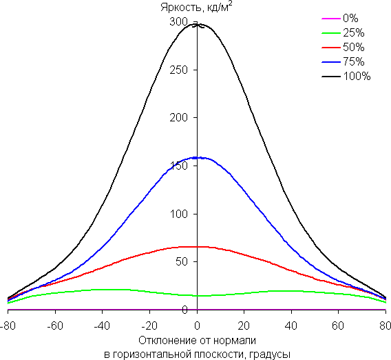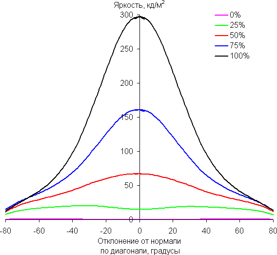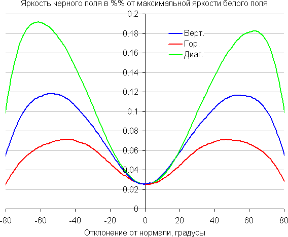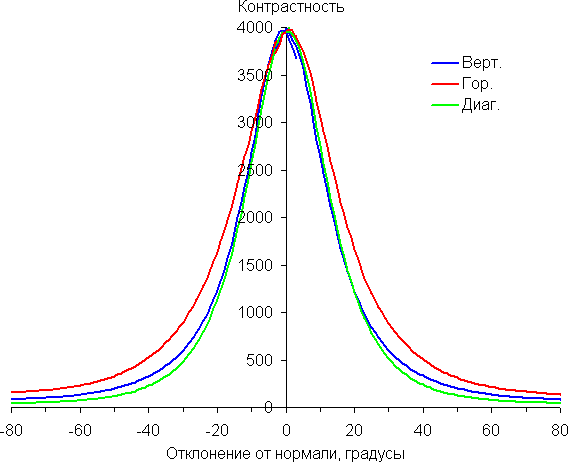 По скорости снижения яркости углы обзора неширокие. Яркость черного поля при отклонении от перпендикуляра к экрану возрастает, но всего до примерно 0,2% от максимальной яркости белого поля и только при большом отклонении. Это очень хороший результат. Контрастность в диапазоне углов ±82° для всех направлений значительно превышает 10:1.