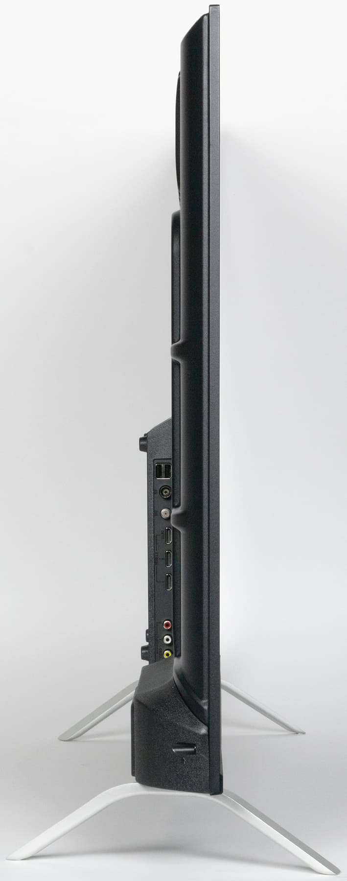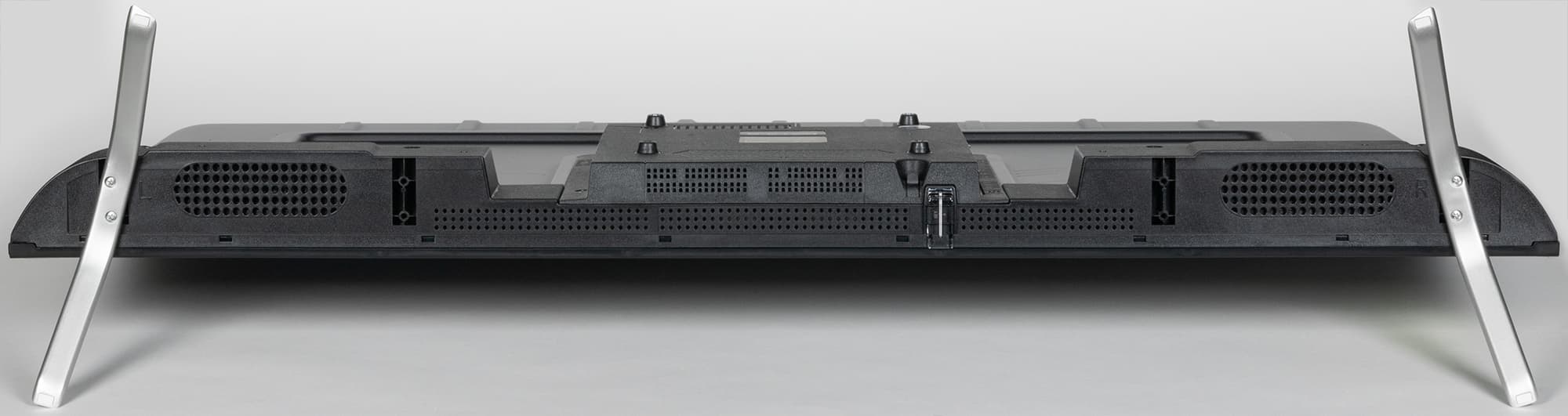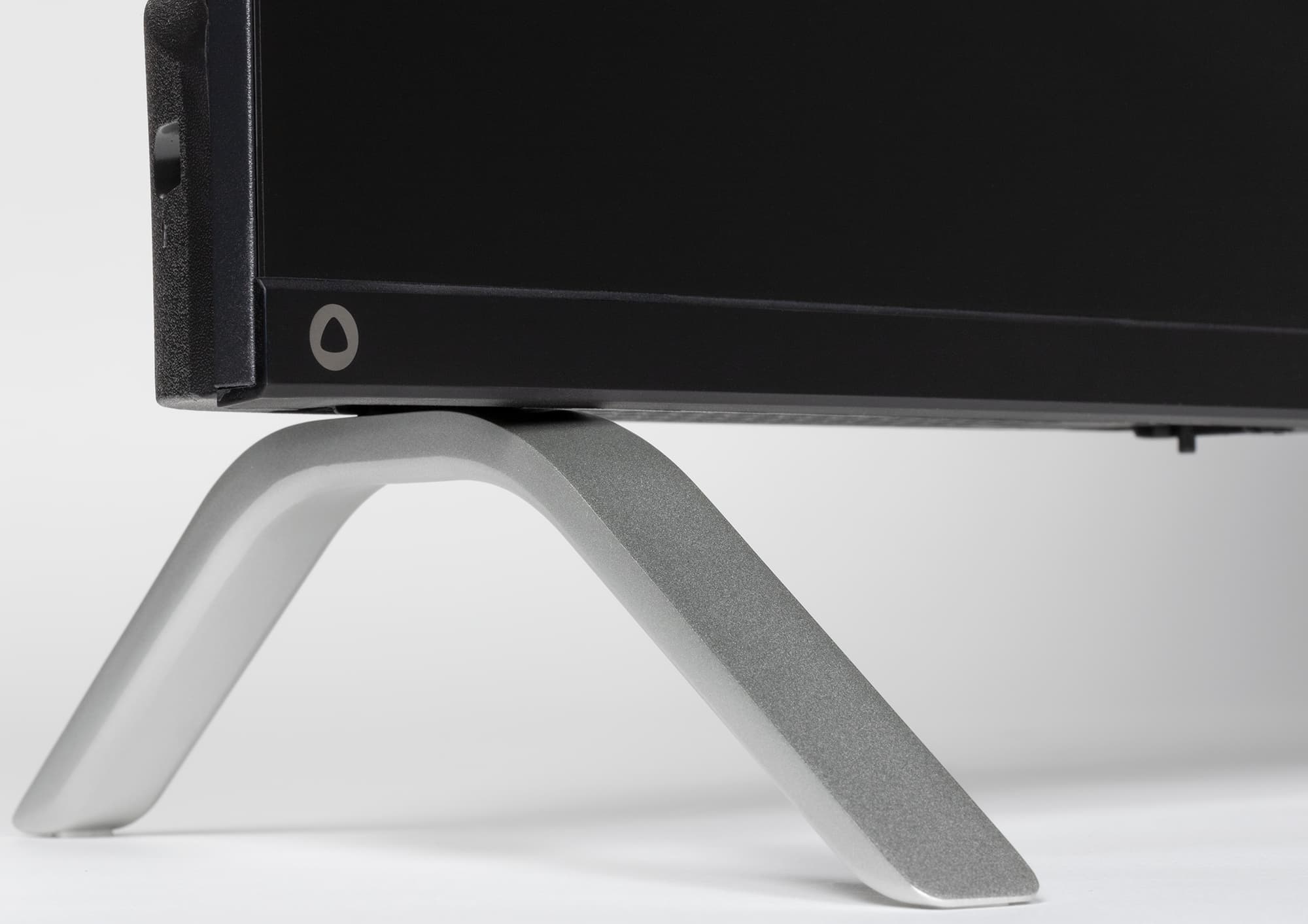 Штатная подставка состоит из двух отлитых из алюминиевого сплава ножек галочкой, которые винтами прикрепляются к нижнему торцу. Опираются ножки на противоскользящие резиновые накладки. Поверхность ножек анодирована и имеет серебристое покрытие. Как пишут создатели телевизора: «Контрастные металлические ножки создают эффект «невесомости», экран телевизора будто «парит» над поверхностью». Отметим, что серебристая и плоская поверхность ножек может при определенном расположении источников света бликовать, что будет отвлекать внимание зрителя.