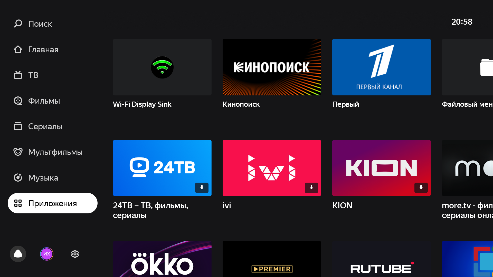 Даже приложения YouTube в явном виде нет (оно есть только в виде веб-версии для Smart TV, и запускается, например, из поисковой выдачи). Магазин приложений также отсутствует. Впрочем, пользователю предлагается список из прямых ссылок, позволяющих установить нескольких популярных приложений. Также приложения, в том числе сторонние магазины, можно установить из файлов APK. Эти файлы, как и, например, фильмы, фотографии и музыку можно записать на USB-носитель, чтобы затем установить или воспроизвести их на телевизоре с помощью уже установленного Файлового менеджера. Впрочем, концепция платформы Яндекс.ТВ предполагает, что пользователь весь необходимый ему контент будет получать непосредственно с домашней страницы телевизора, по необходимости используя Алису в качестве советчика, а потому особой надобности в использовании сторонних приложений нет.